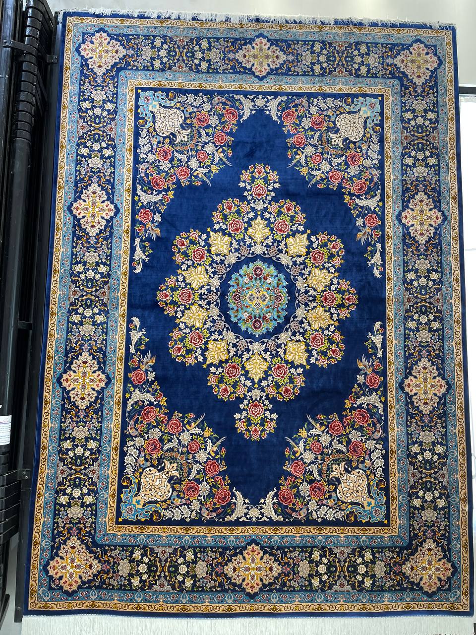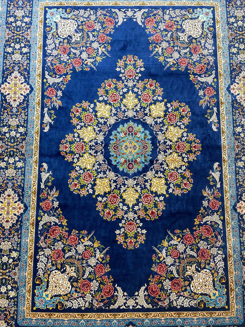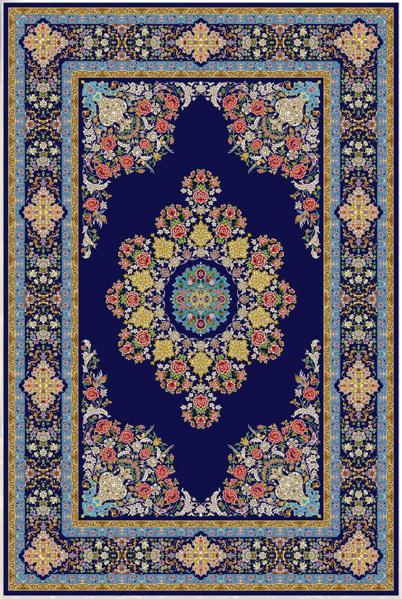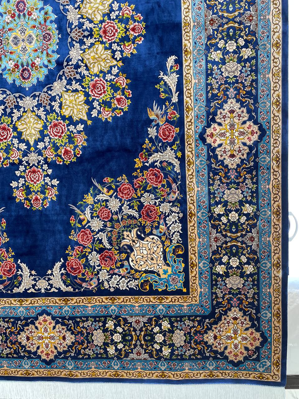 فرش ماشینی پشم ابریشم 1200 شانه زمینه آبی کاربنی کد3212