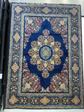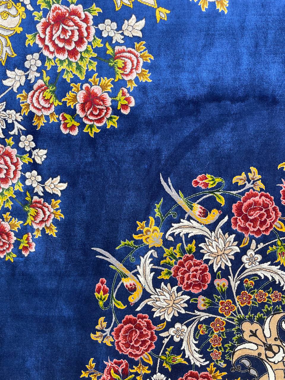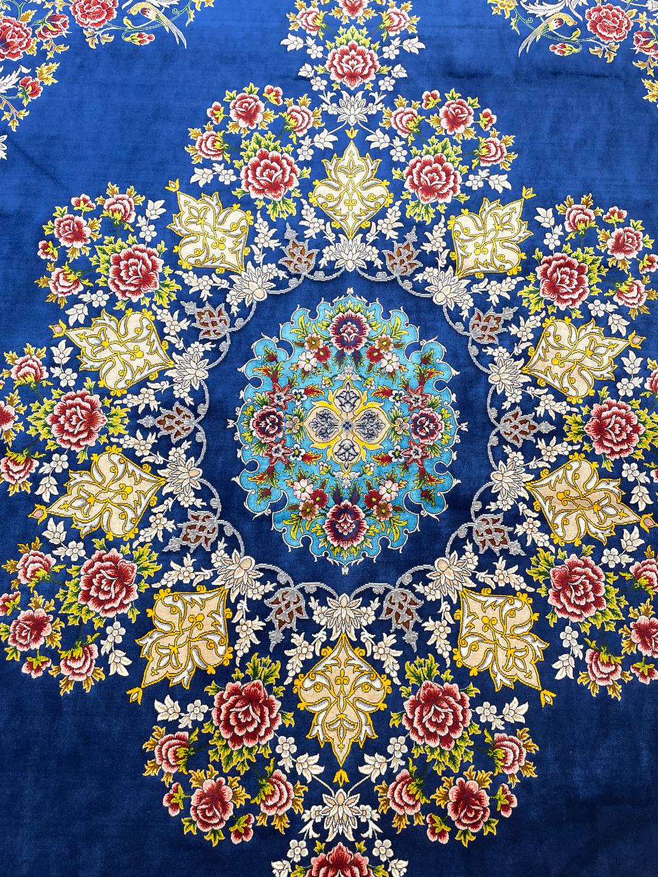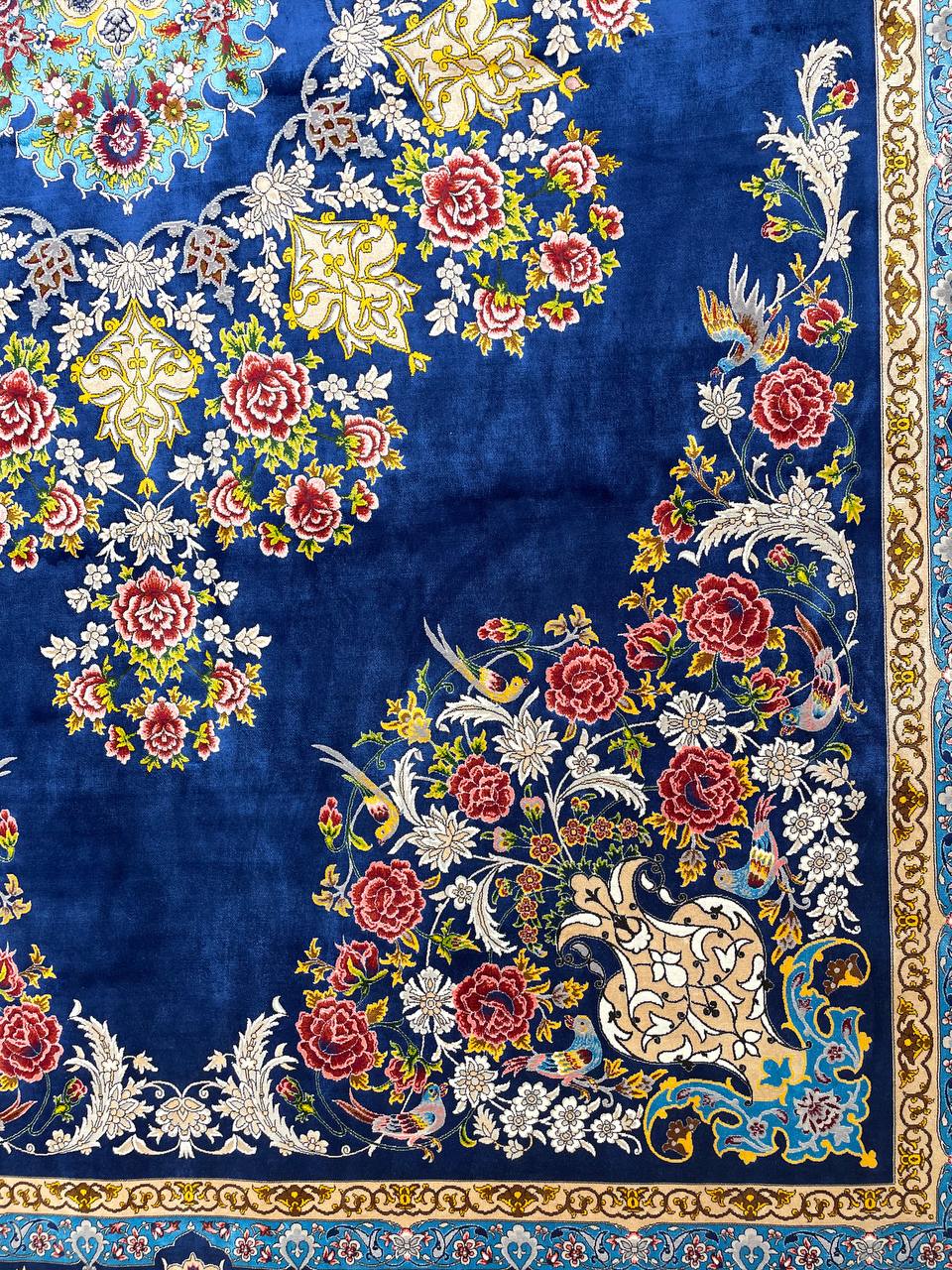 فرش ماشینی پشم ابریشم 1200 شانه زمینه آبی کاربنی کد3212