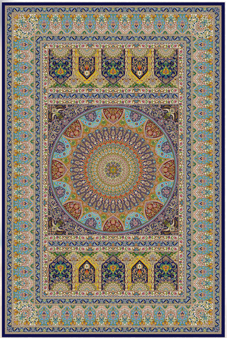 فرش ماشینی پشم ابریشم 1200 شانه زمینه آبی کاربنی کد3214