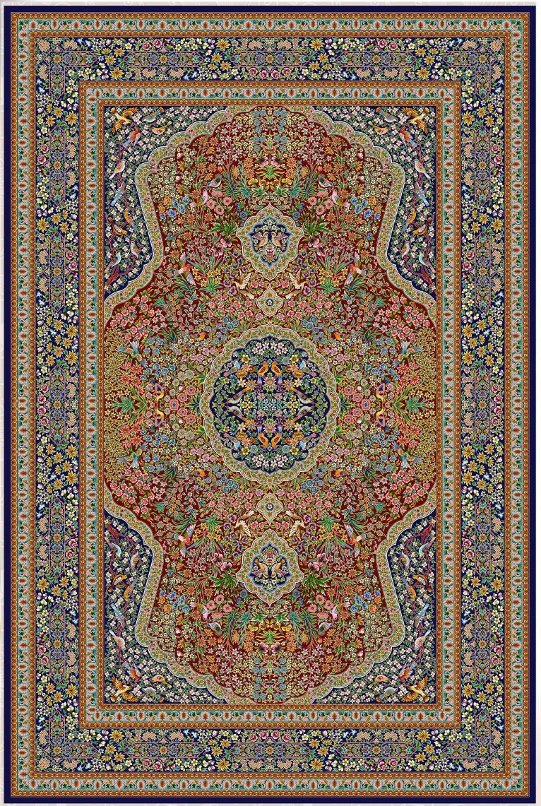 فرش ماشینی پشم ابریشم 1200 شانه زمینه آبی کاربنی کد3215