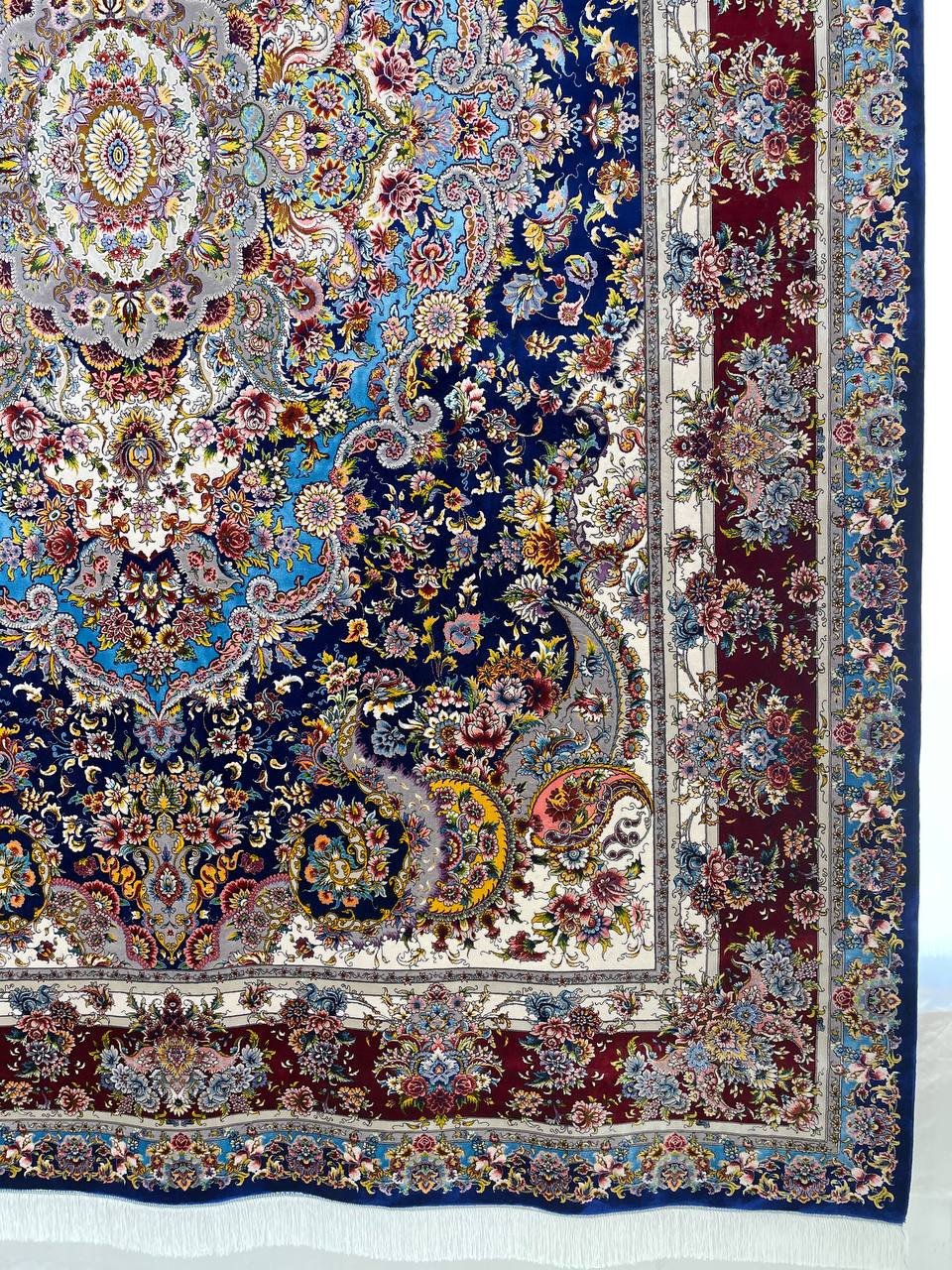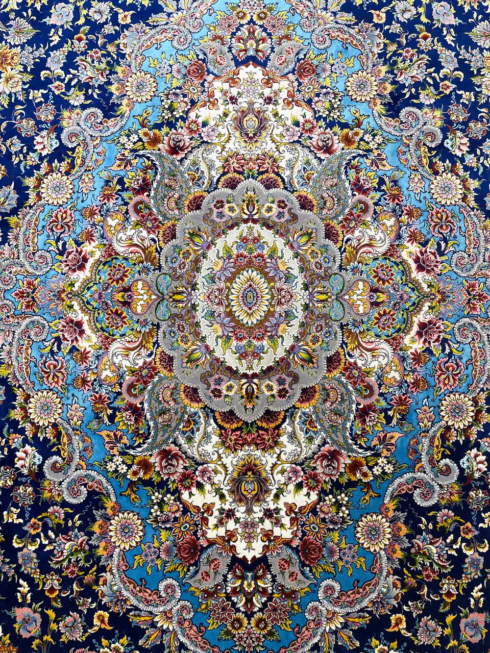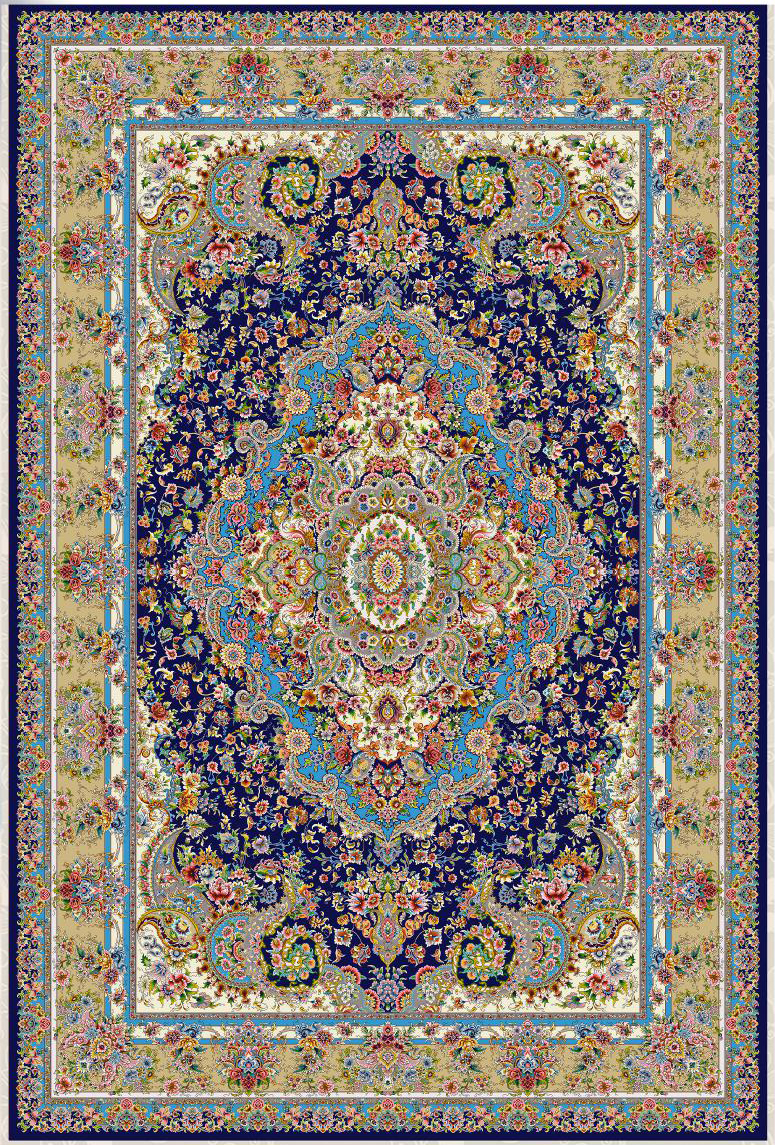 فرش ماشینی پشم ابریشم 1200 شانه زمینه آبی کاربنی کد3216