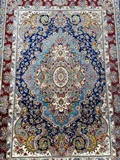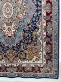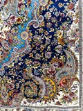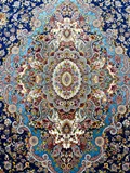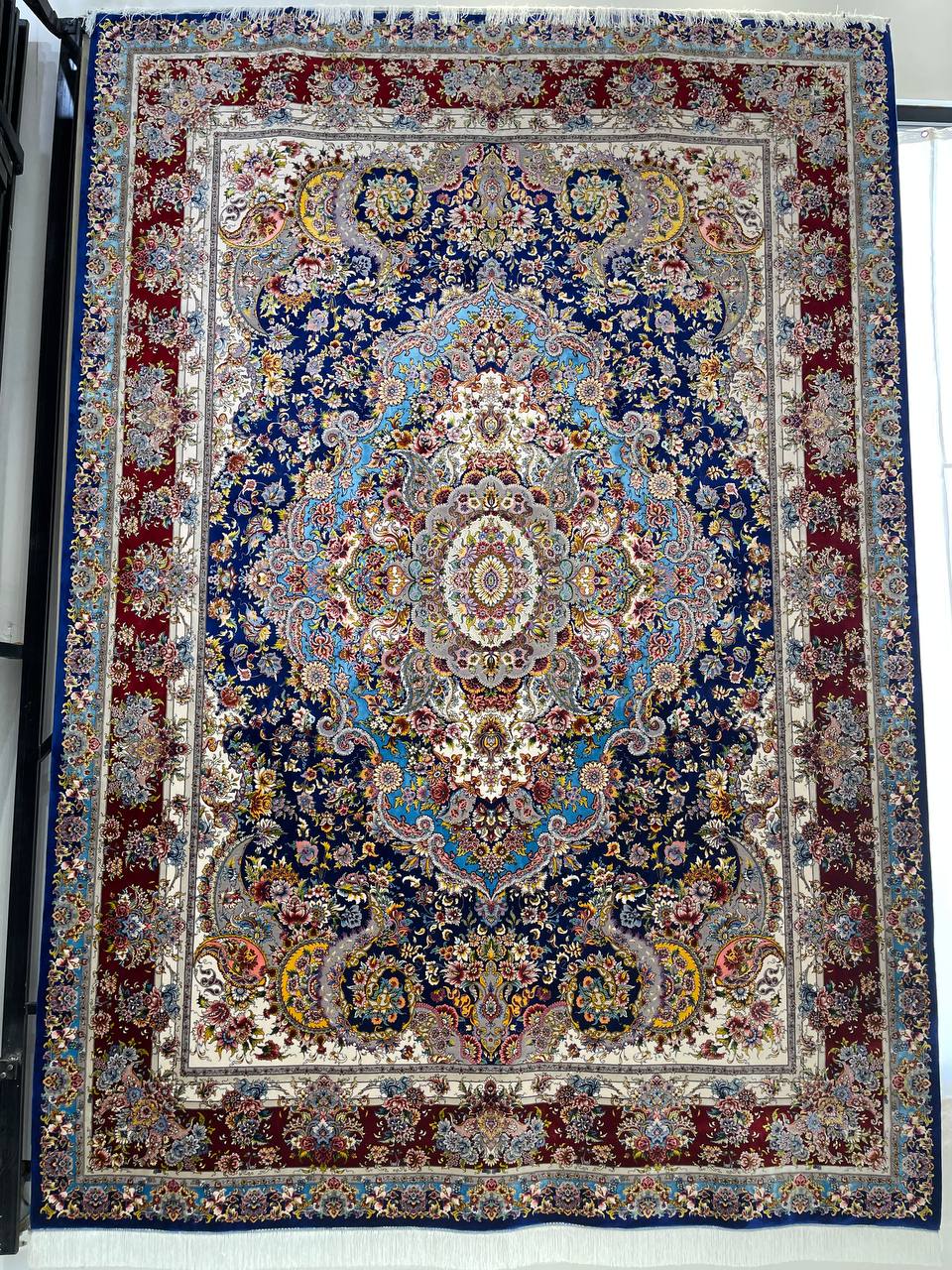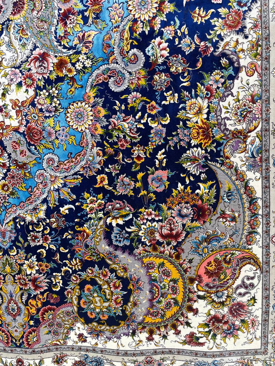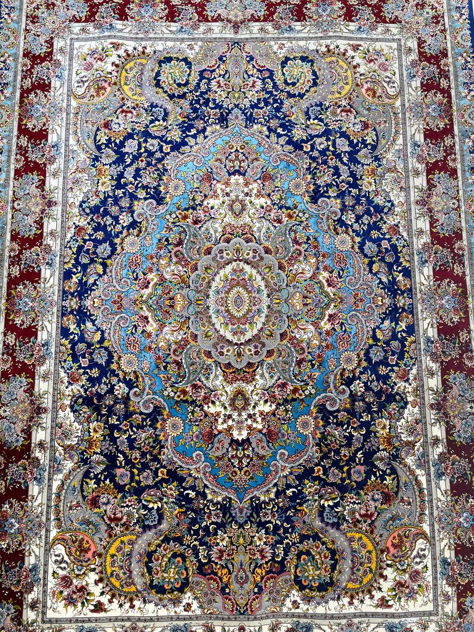 فرش ماشینی پشم ابریشم 1200 شانه زمینه آبی کاربنی کد3216