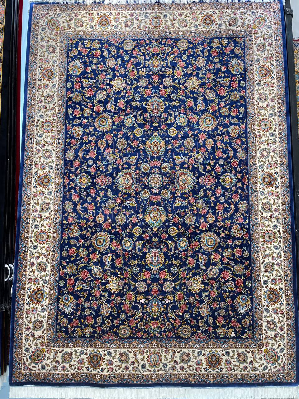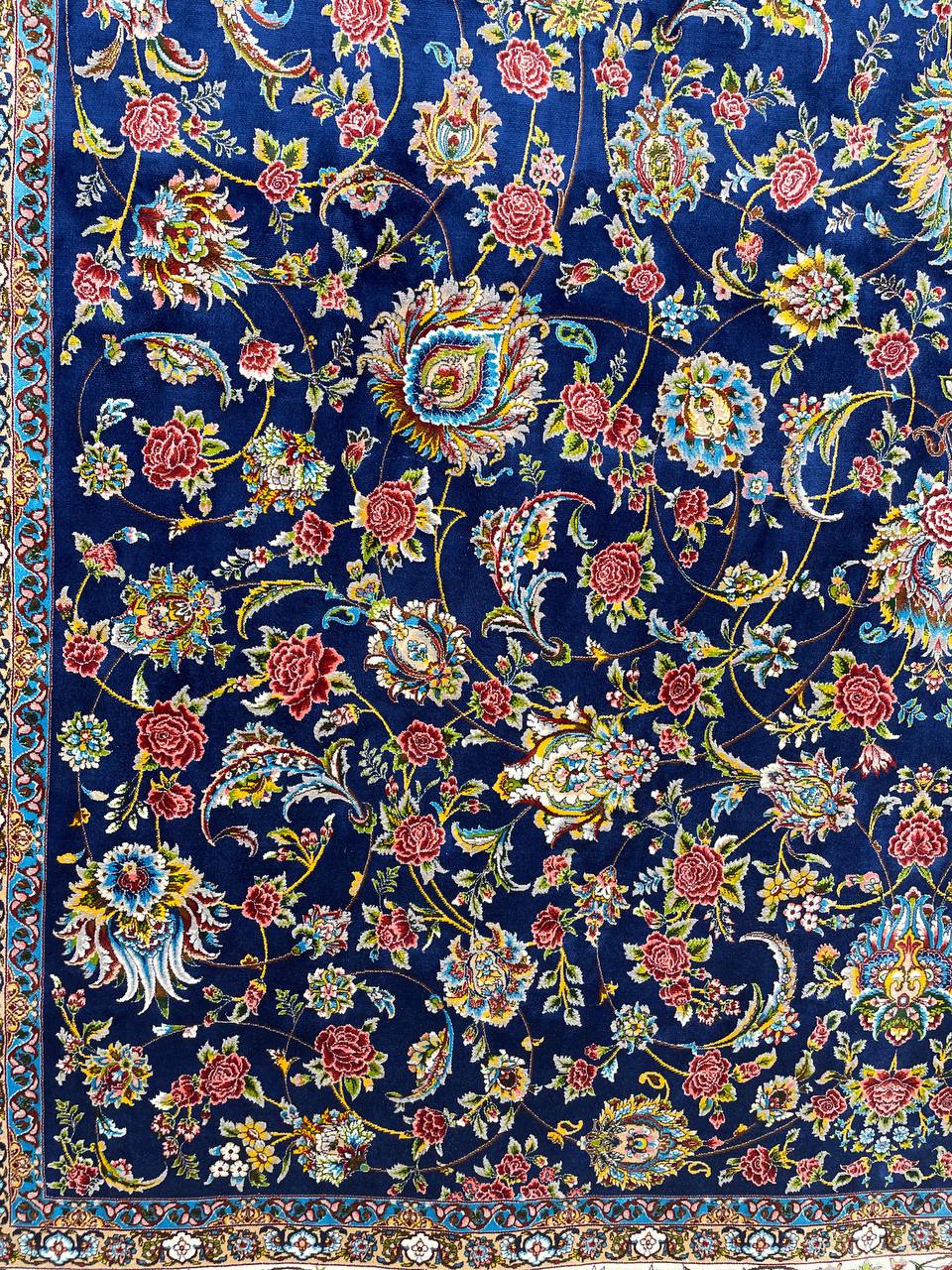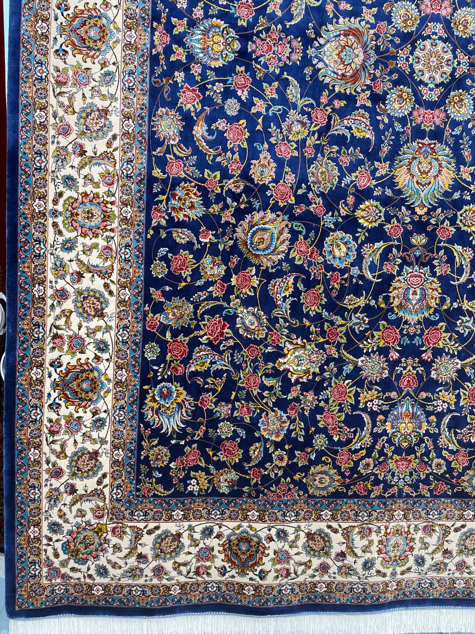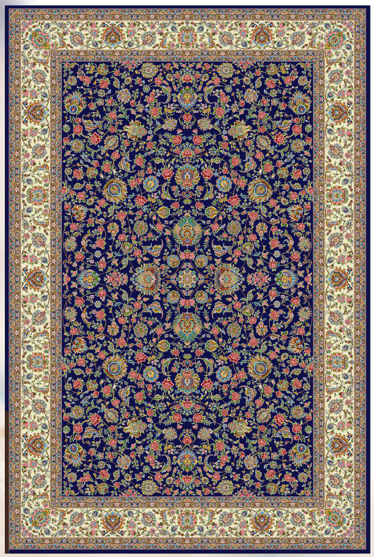 فرش ماشینی پشم ابریشم 1200 شانه زمینه آبی کاربنی کد3226