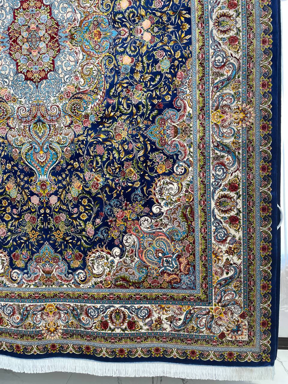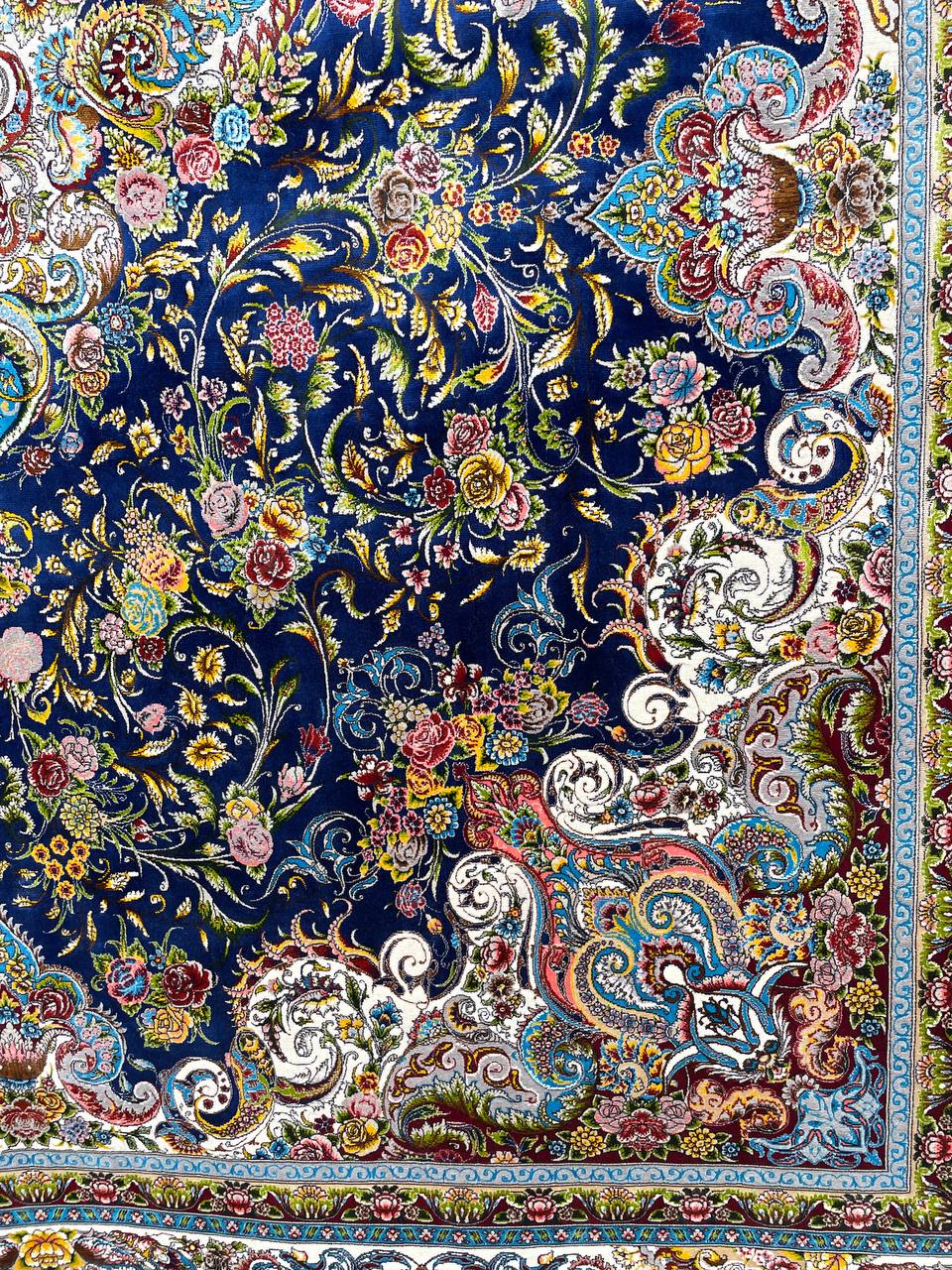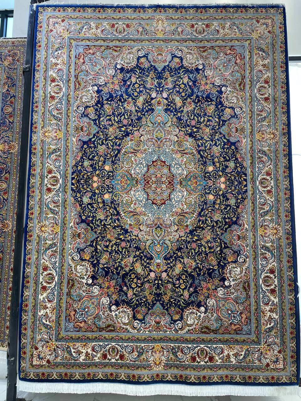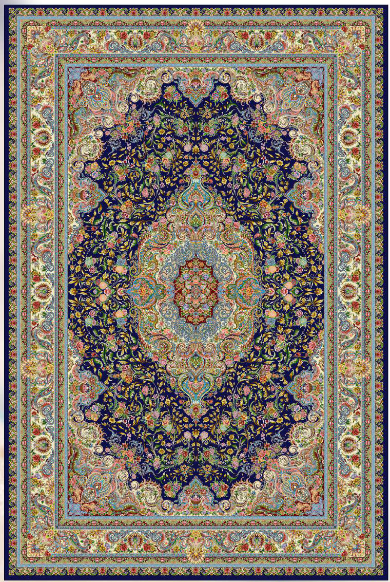 فرش ماشینی پشم ابریشم 1200 شانه زمینه آبی کاربنی کد3227
