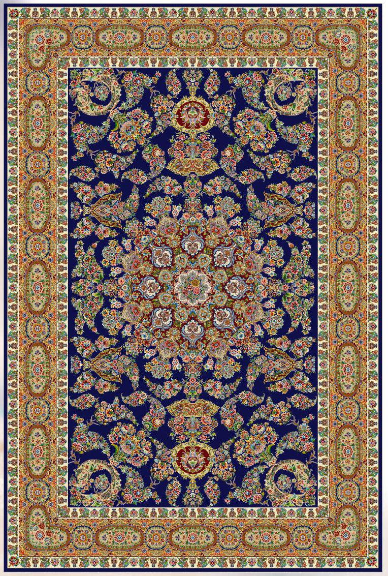 فرش ماشینی پشم ابریشم 1200 شانه زمینه آبی کاربنی کد3232