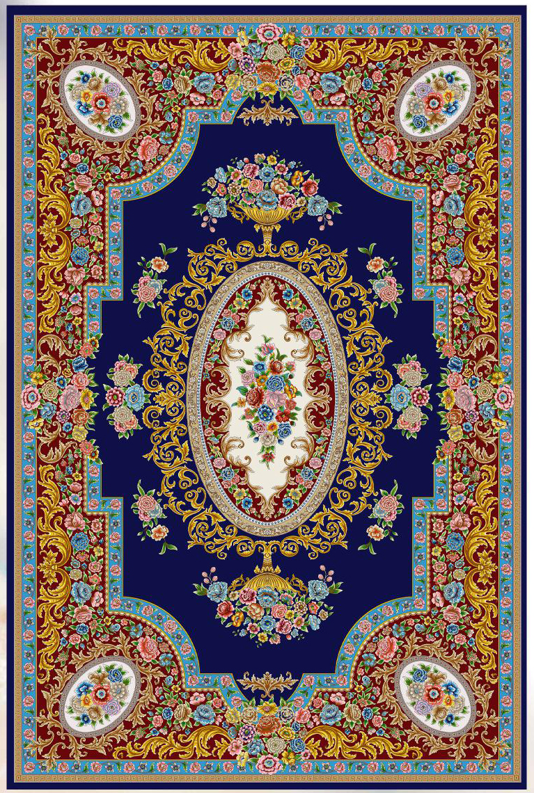 فرش ماشینی پشم ابریشم 1200 شانه زمینه آبی کاربنی کد3238