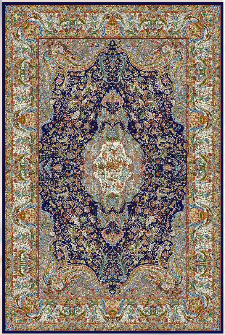 فرش ماشینی پشم ابریشم 1200 شانه زمینه آبی کاربنی کد3239