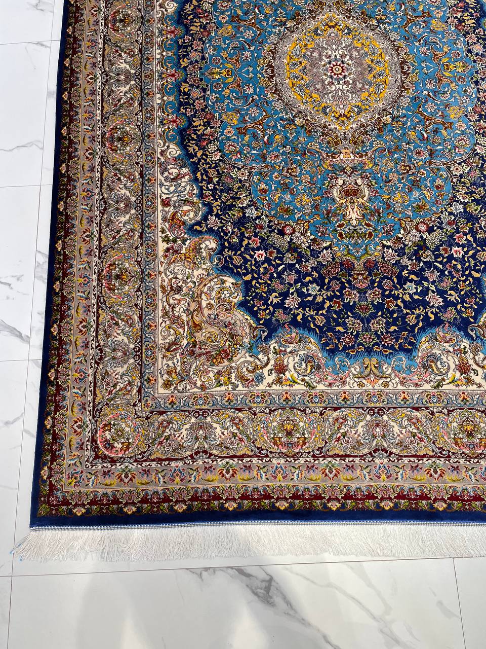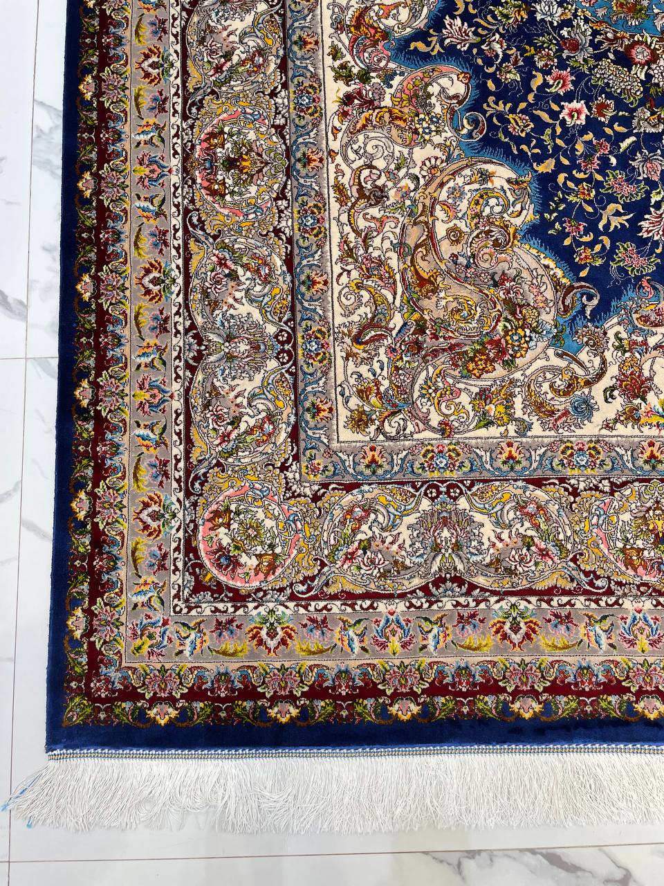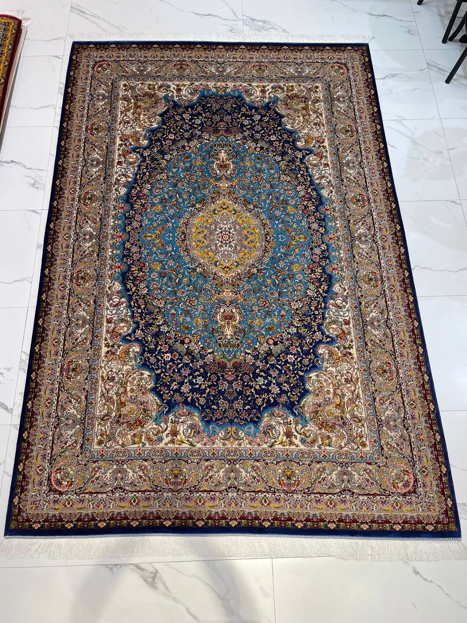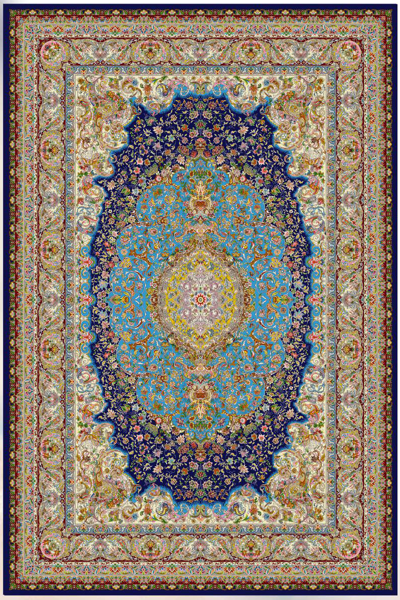 فرش ماشینی پشم ابریشم 1200 شانه زمینه آبی کاربنی کد3244