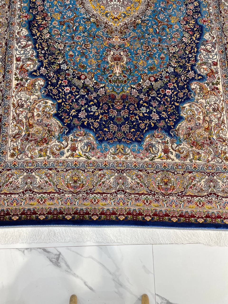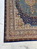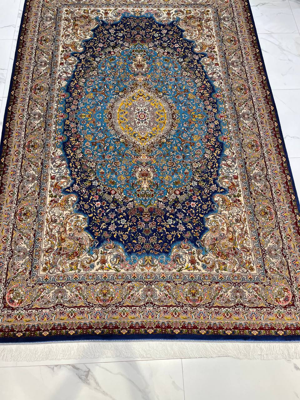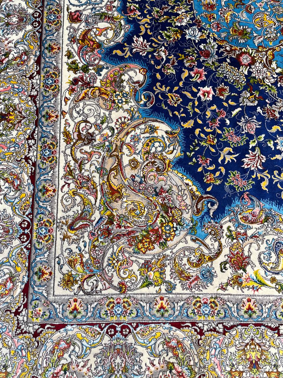 فرش ماشینی پشم ابریشم 1200 شانه زمینه آبی کاربنی کد3244