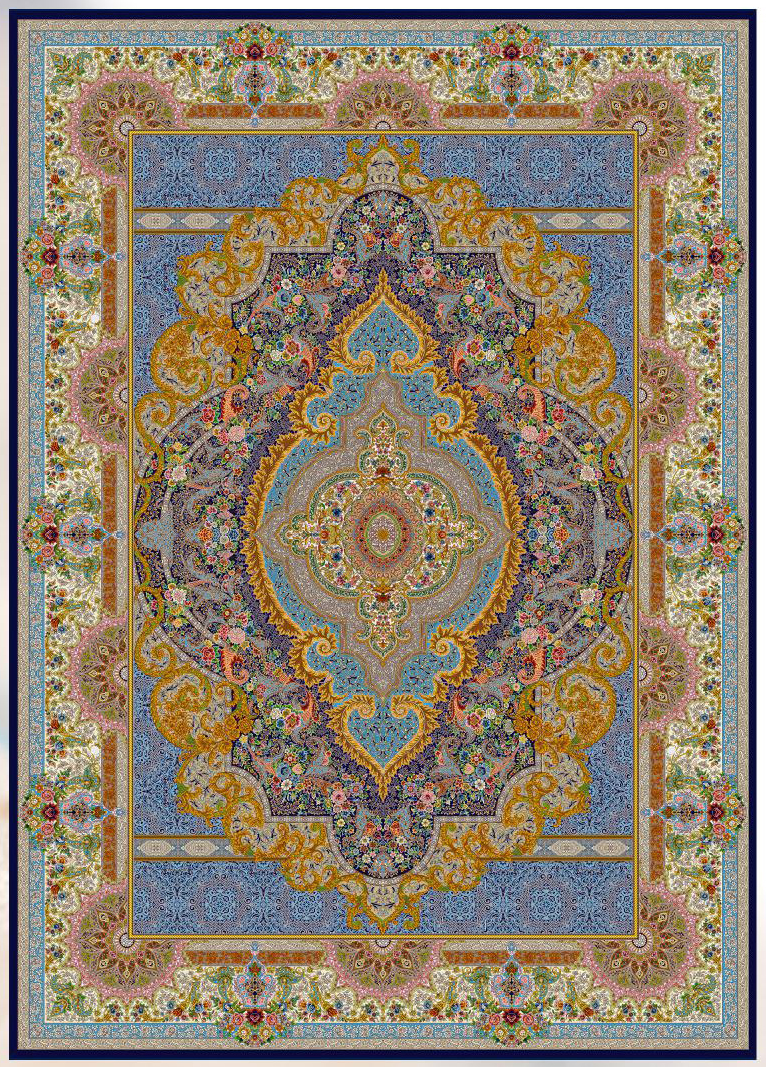 فرش ماشینی پشم ابریشم 1200 شانه زمینه آبی کاربنی کد3251