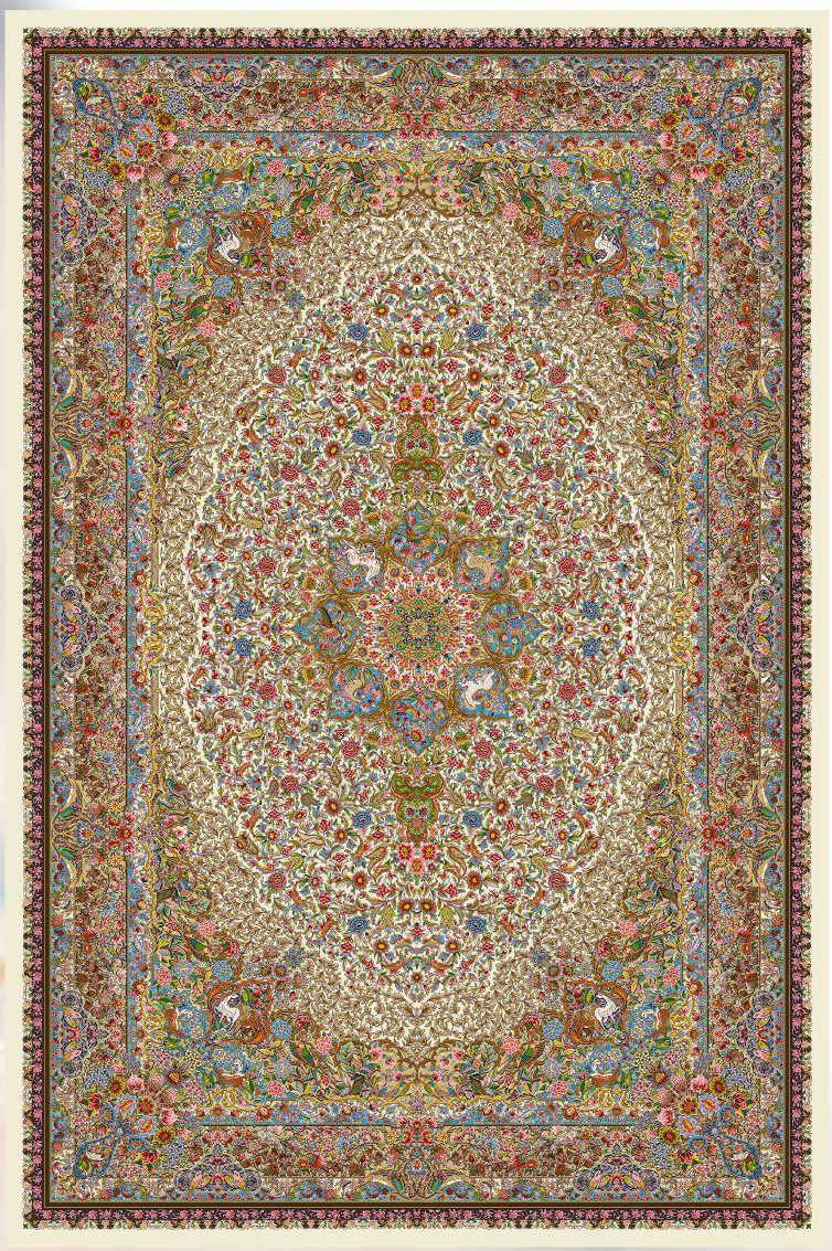 فرش ماشینی پشم ابریشم 1200 شانه زمینه کرم کد3256
