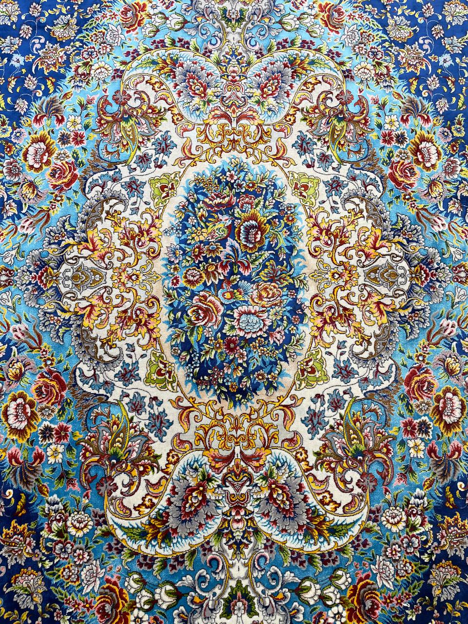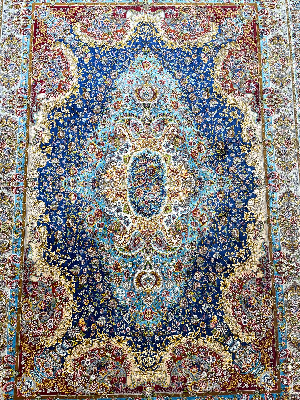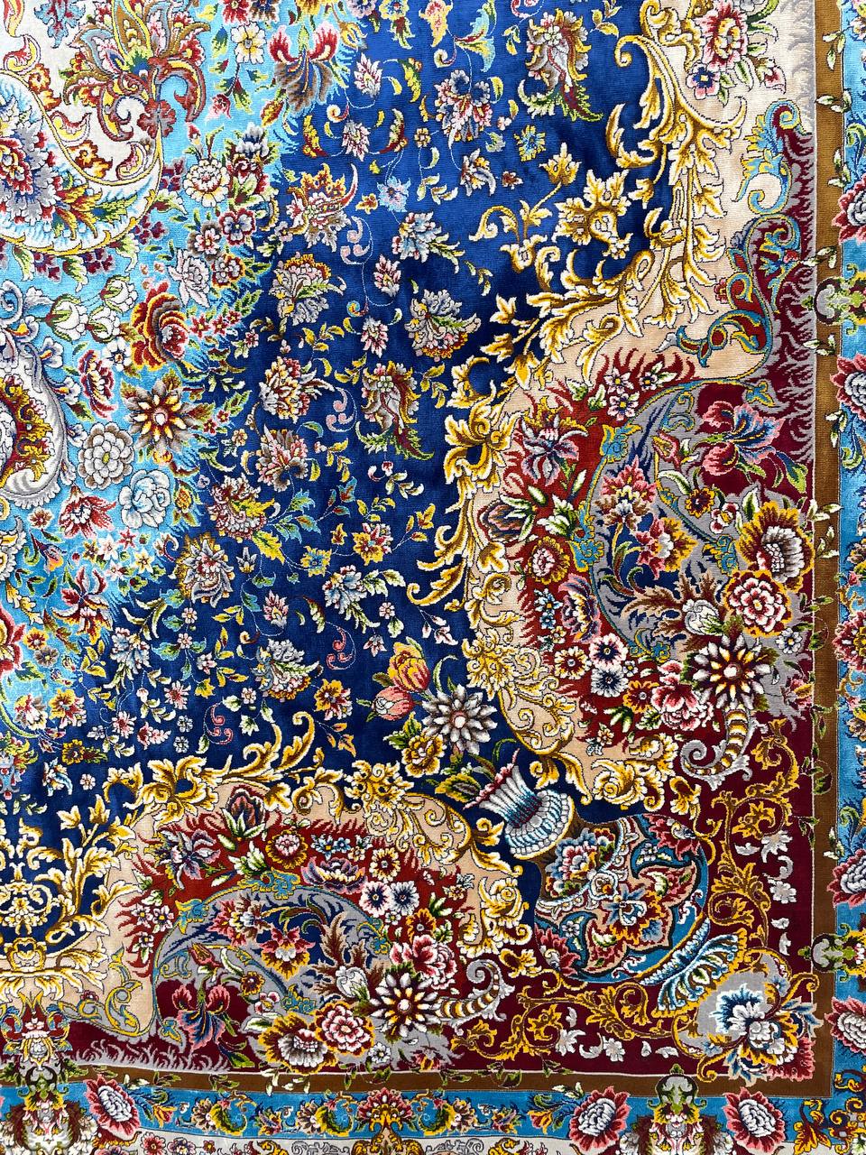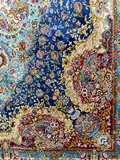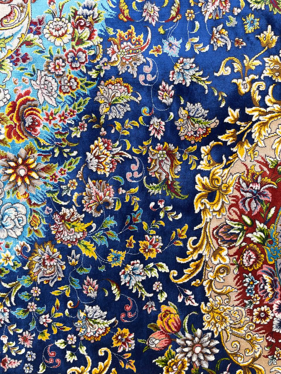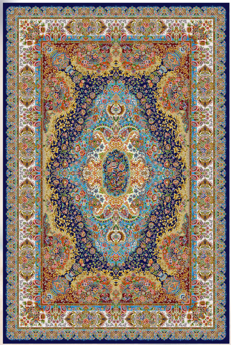فرش ماشینی پشم ابریشم 1200 شانه زمینه آبی کاربنی کد3224