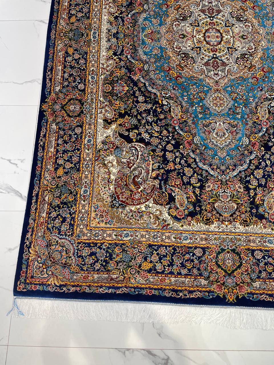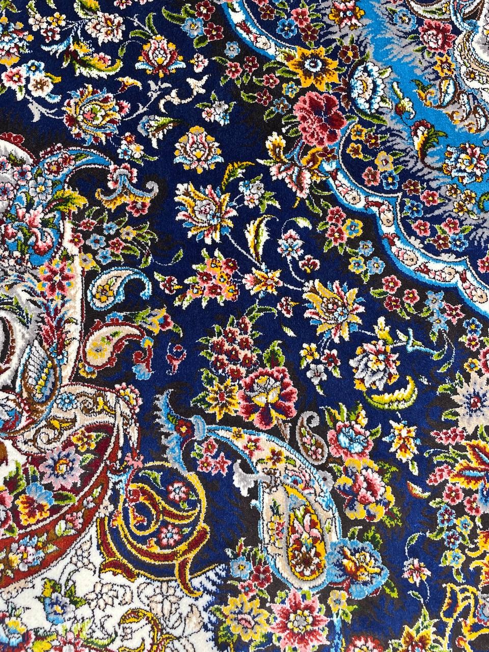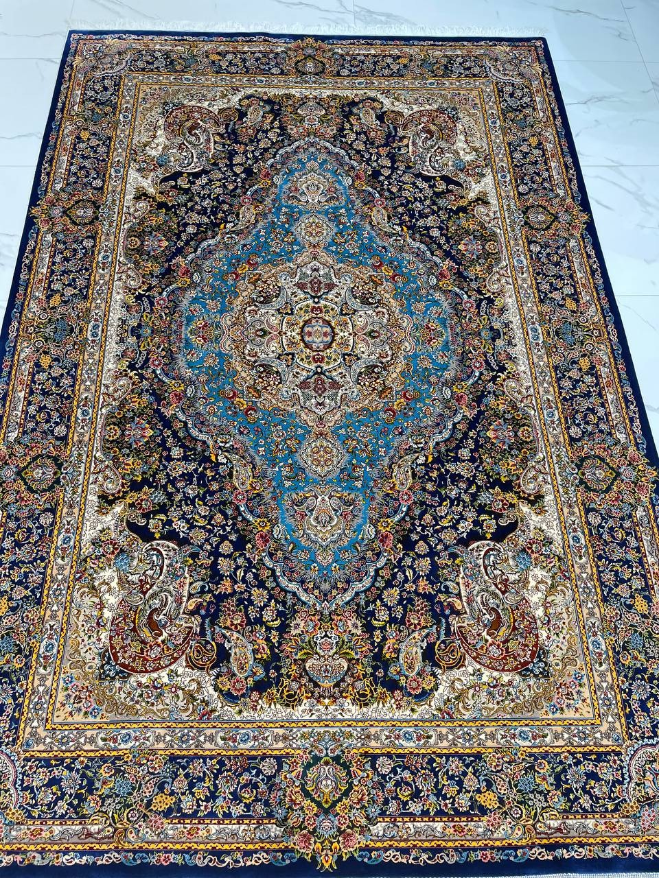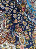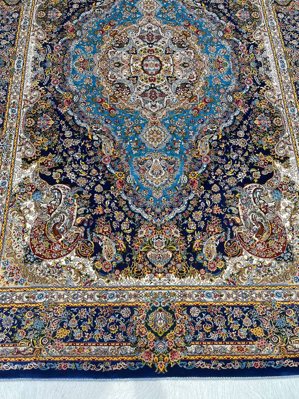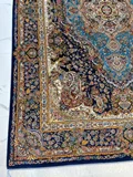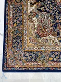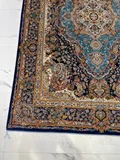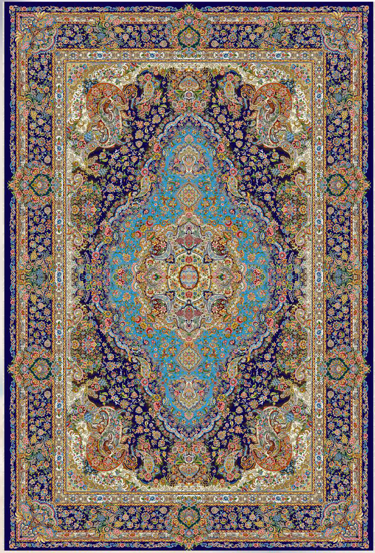 فرش ماشینی پشم ابریشم 1200 شانه زمینه آبی کاربنی کد3213