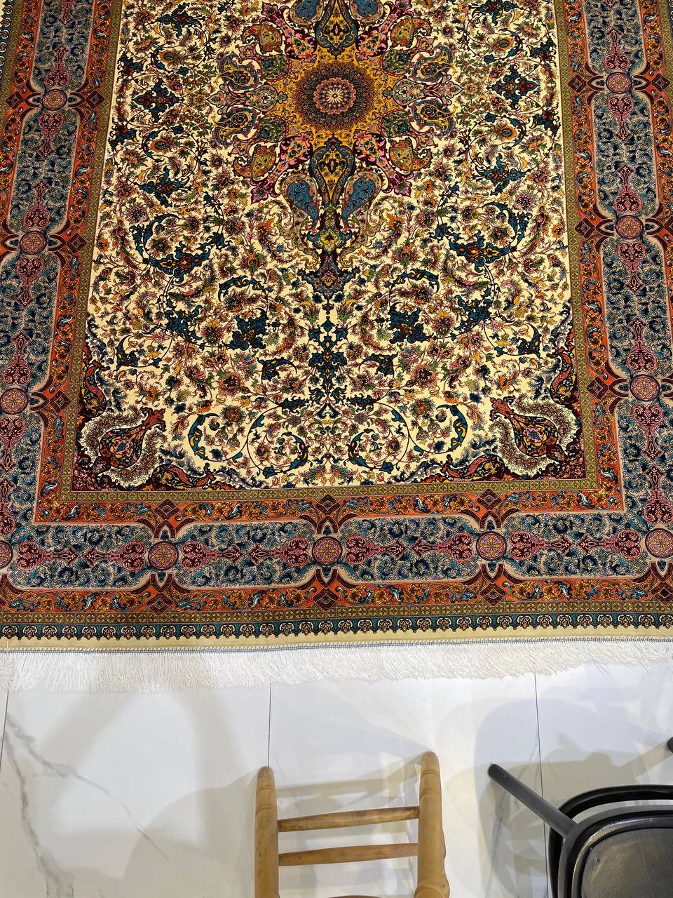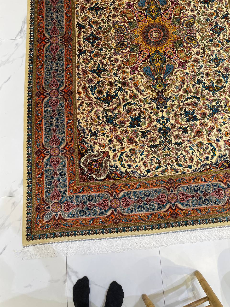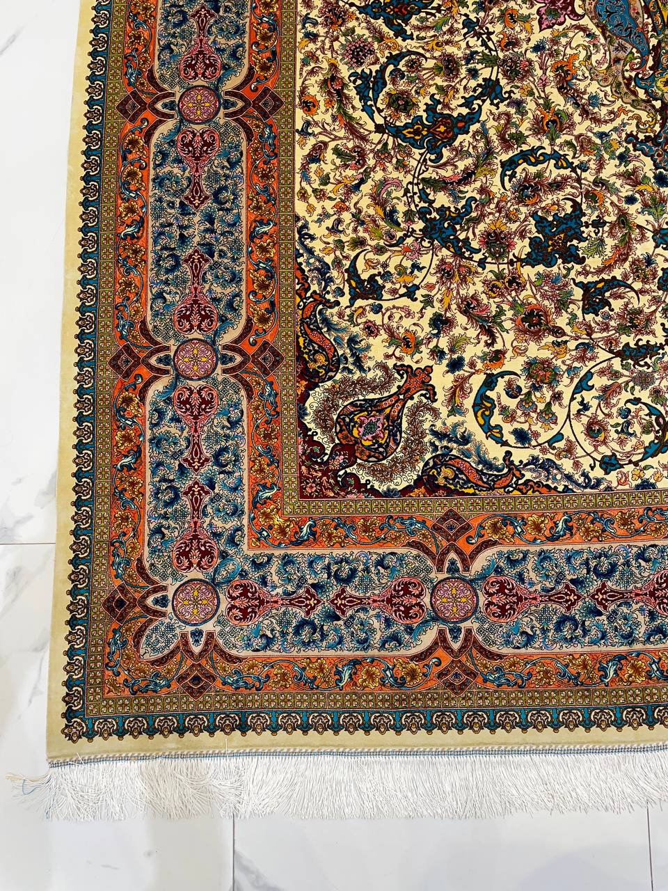 فرش ماشینی ابریشم 1500 شانه کاشان زمینه کرم کد5595