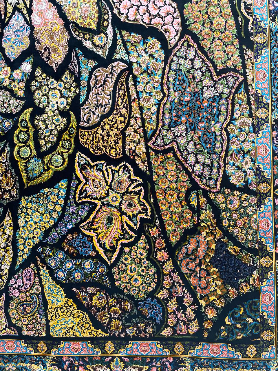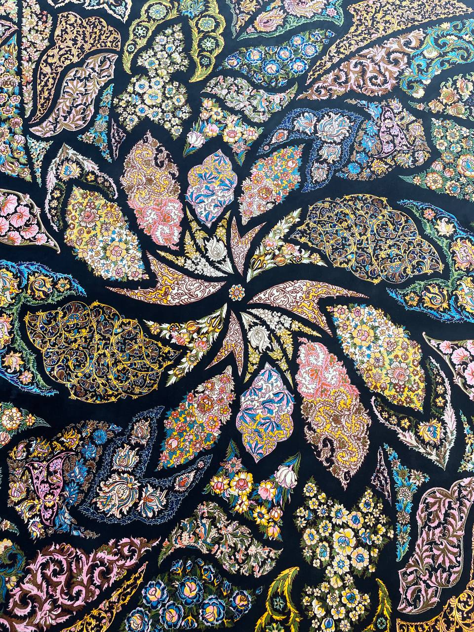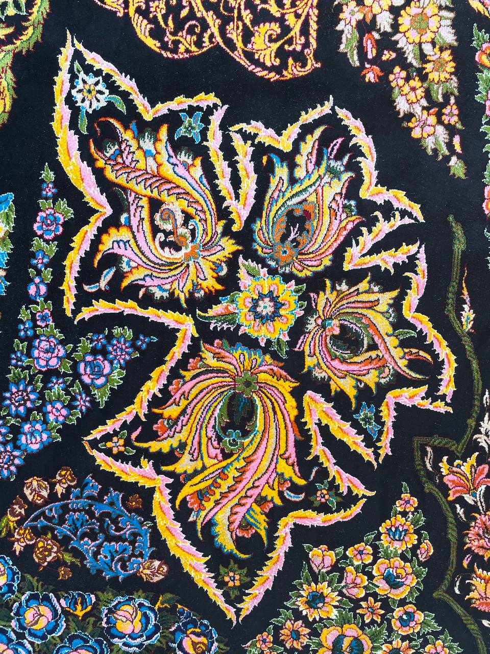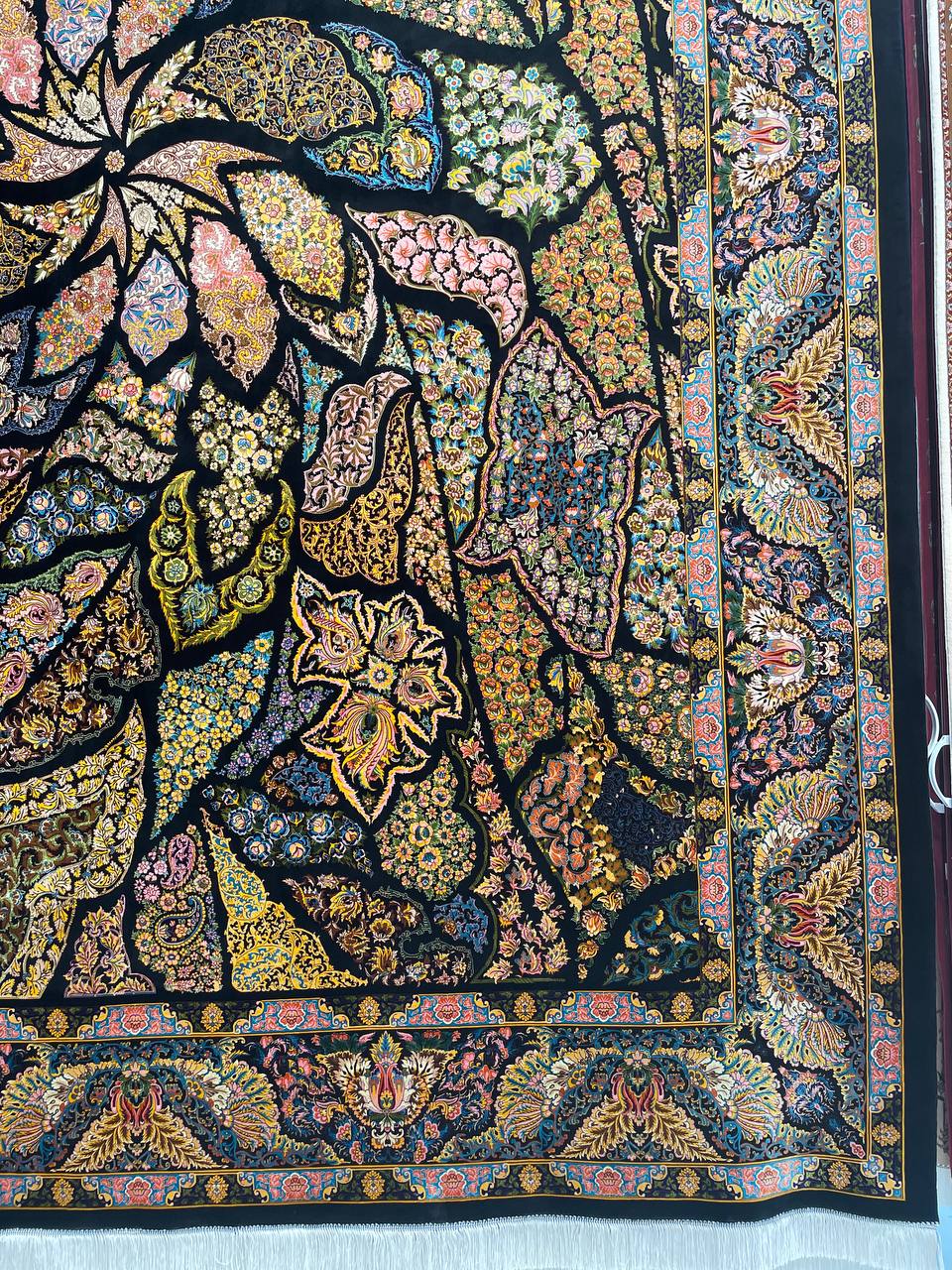 فرش ماشینی ابریشم 1500 شانه کاشان زمینه مشکی کد 5510