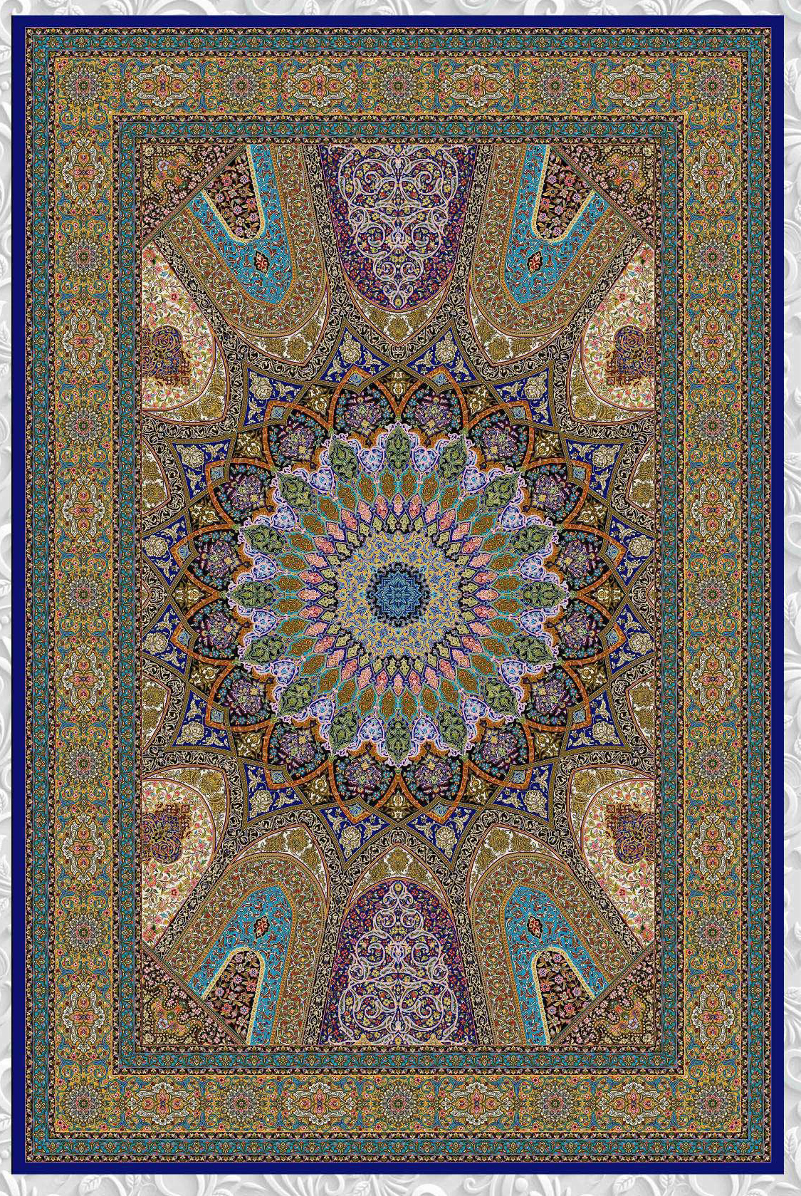 فرش ماشینی ابریشم 1500 شانه کاشان زمینه آبی کاربنی کد5550