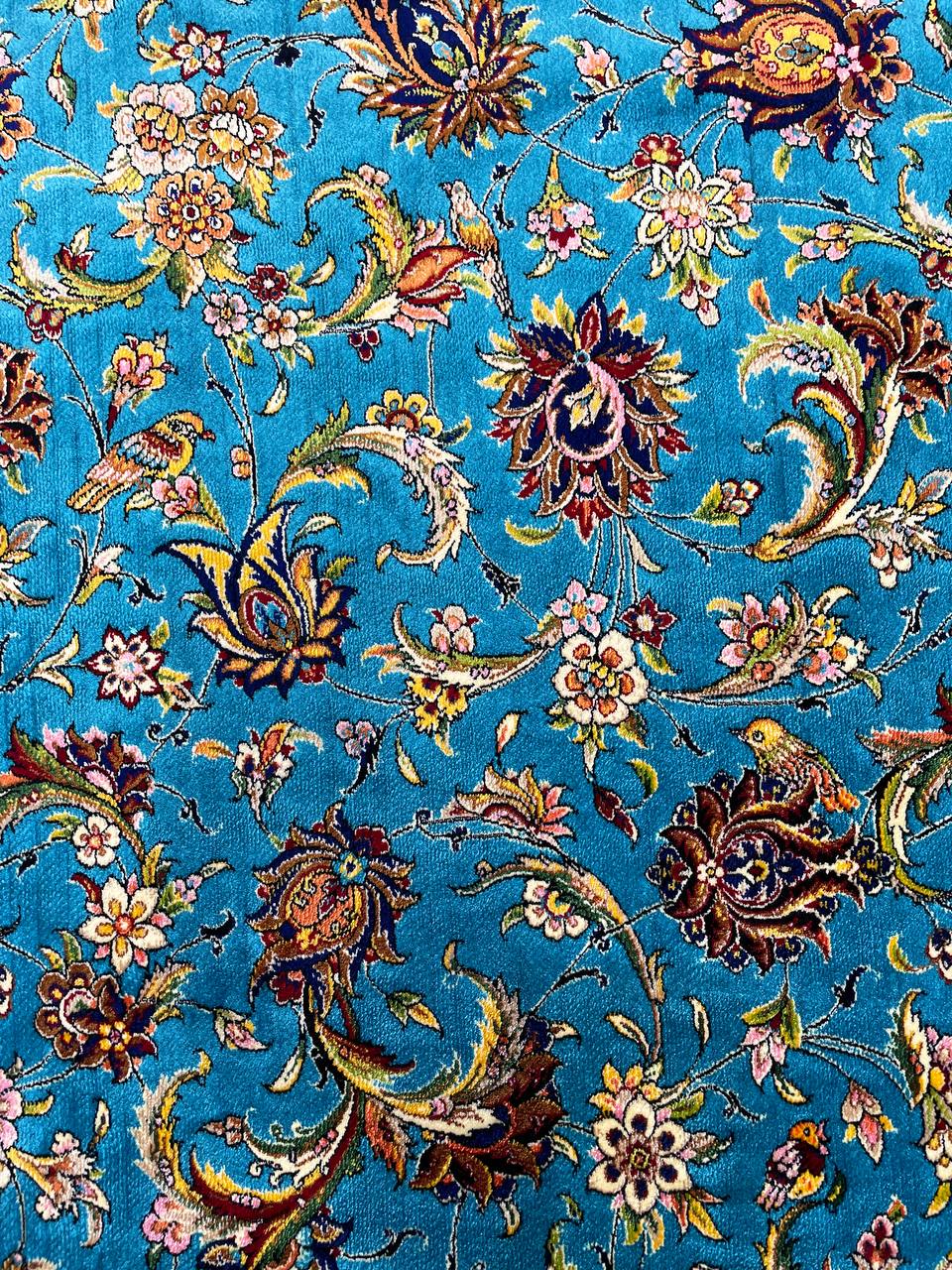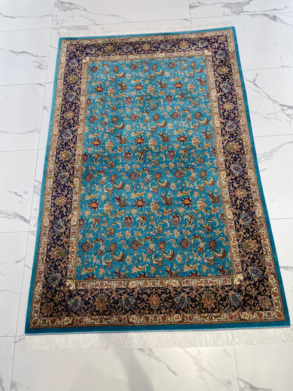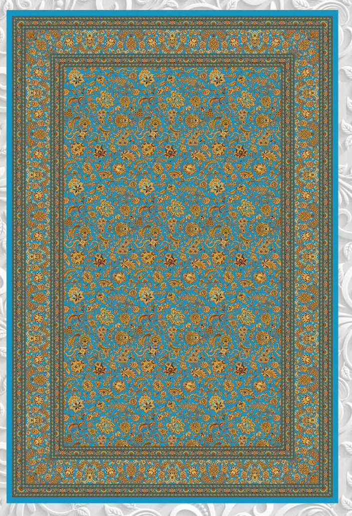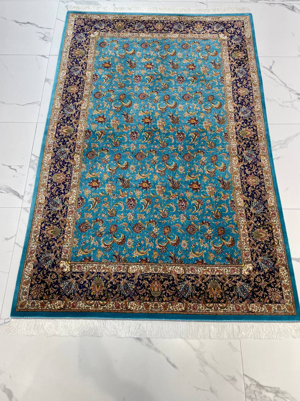 فرش ماشینی ابریشم 1500 شانه کاشان زمینه آبی کد5558