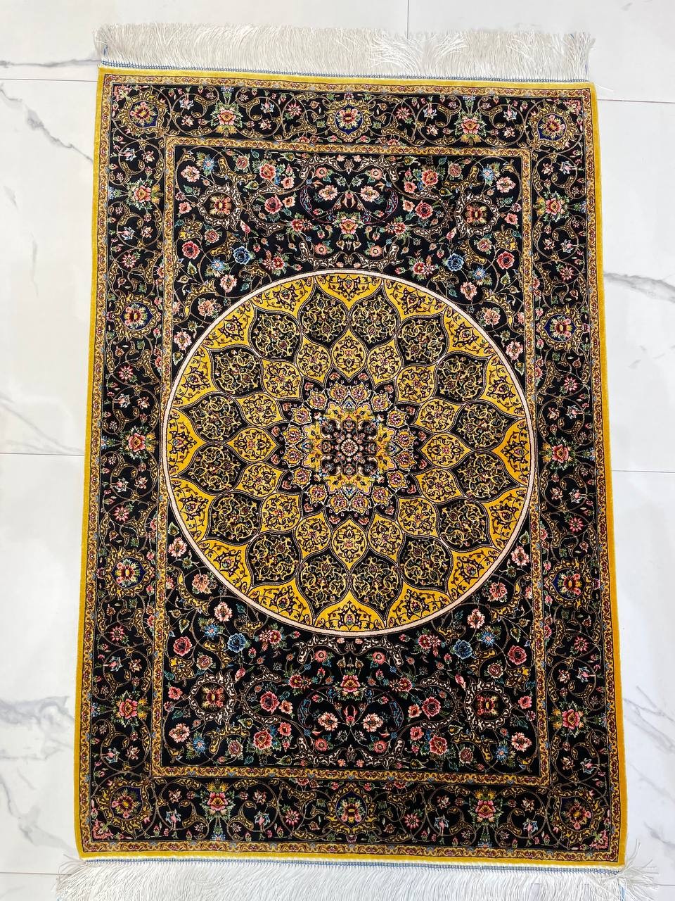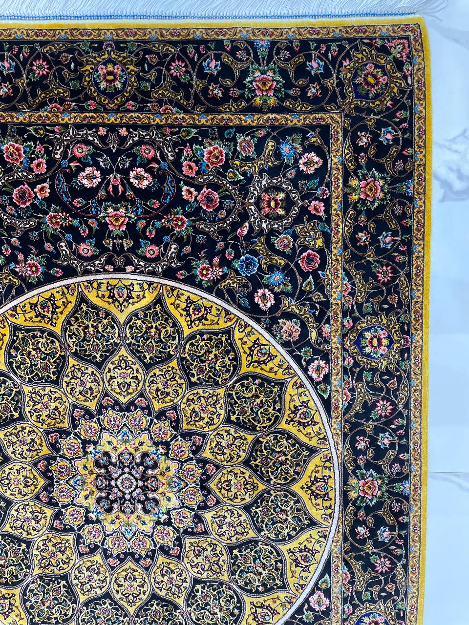 فرش ماشینی ابریشم 1500 شانه کاشان زمینه طلایی کد5561