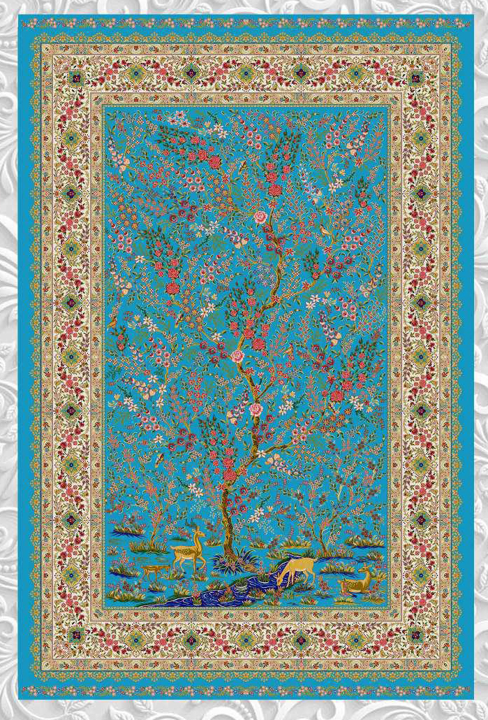 فرش ماشینی ابریشم 1500 شانه کاشان زمینه آبی کد5563