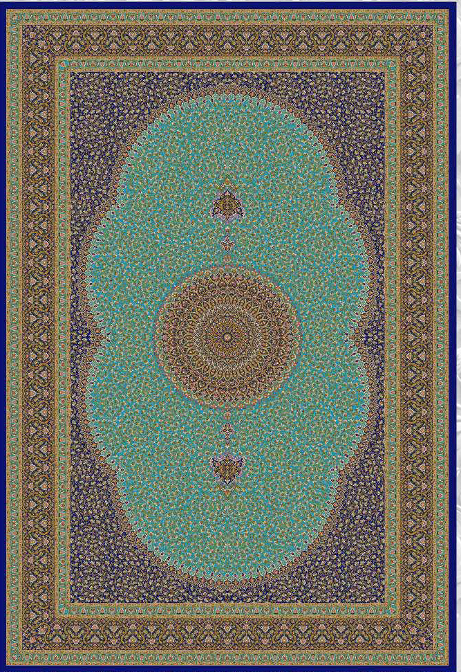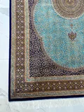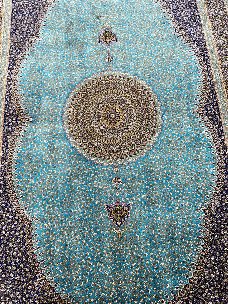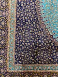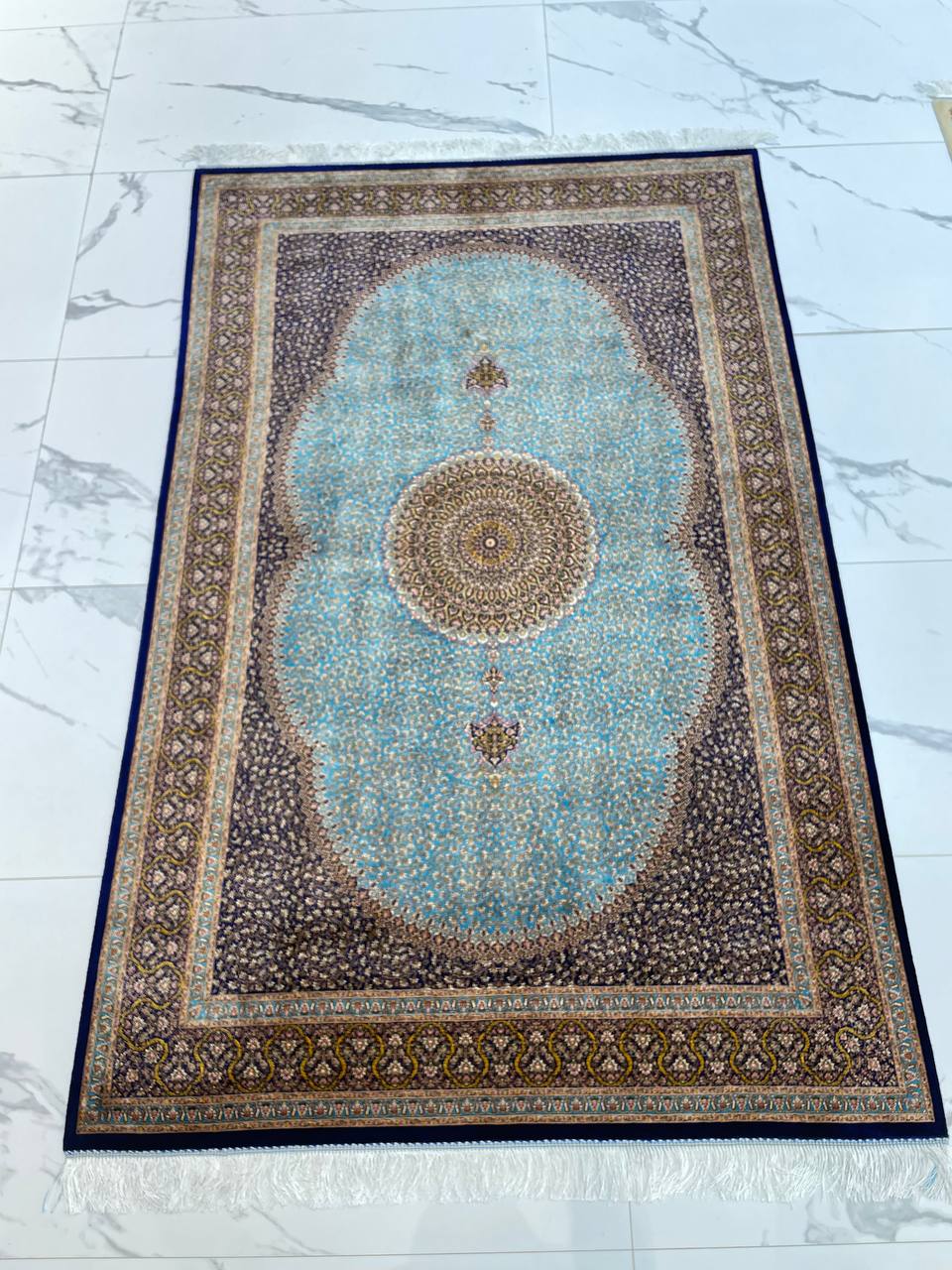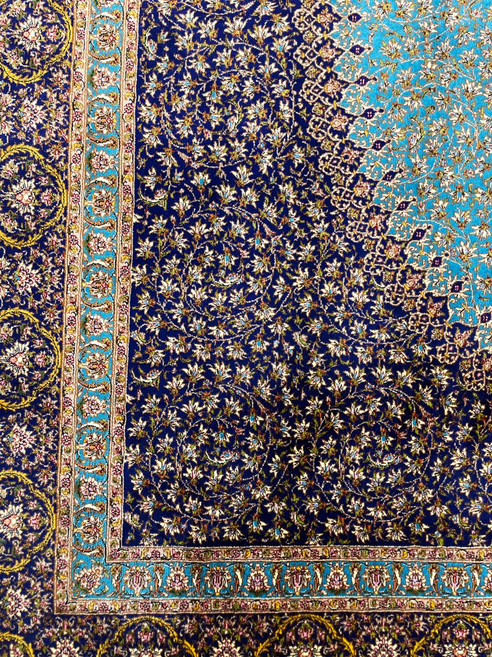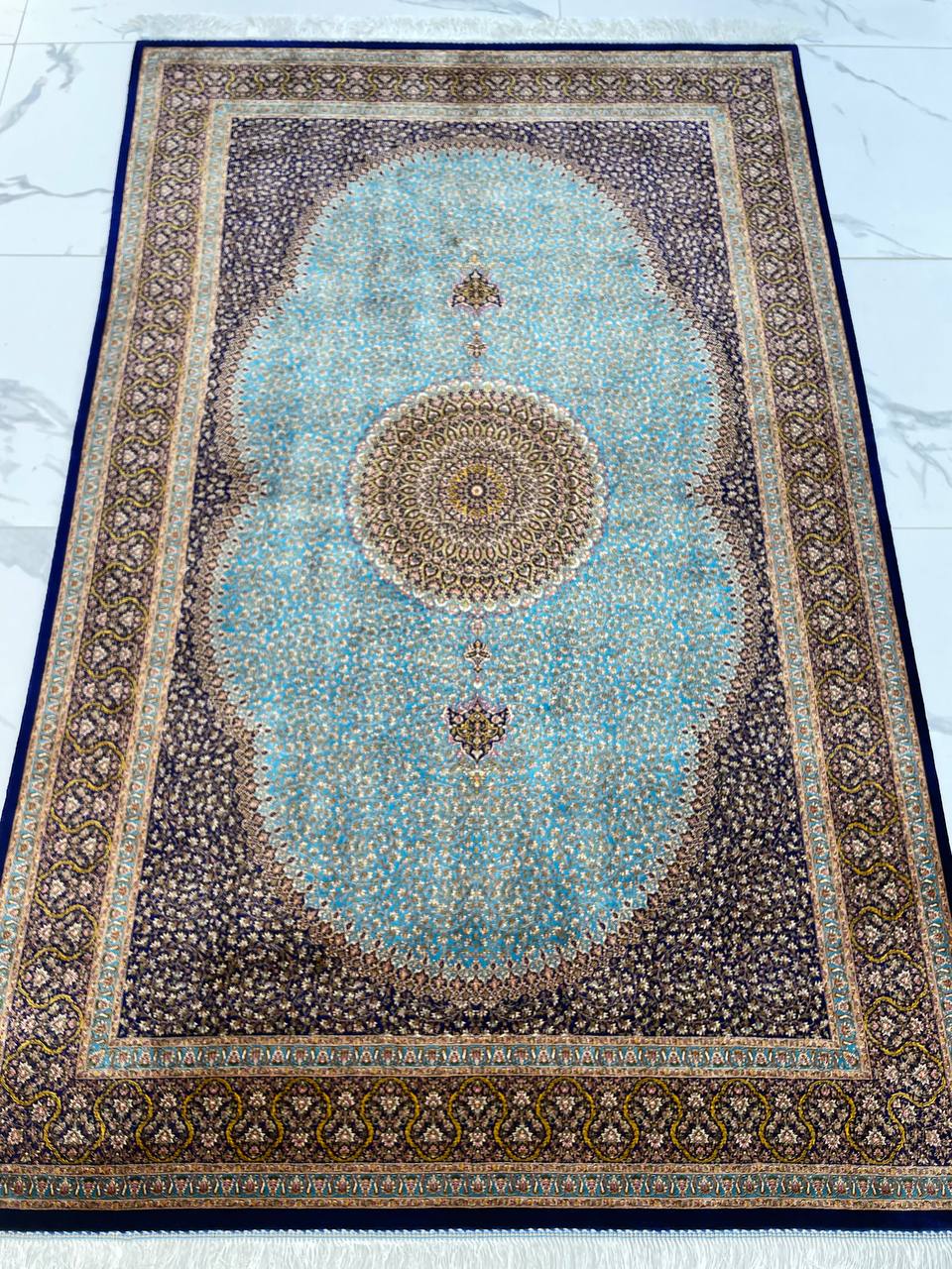 فرش ماشینی ابریشم 1500 شانه کاشان زمینه آبی کد5513