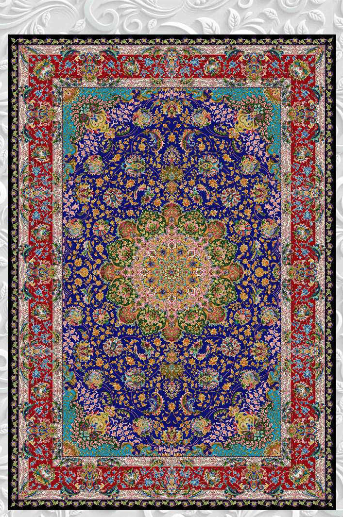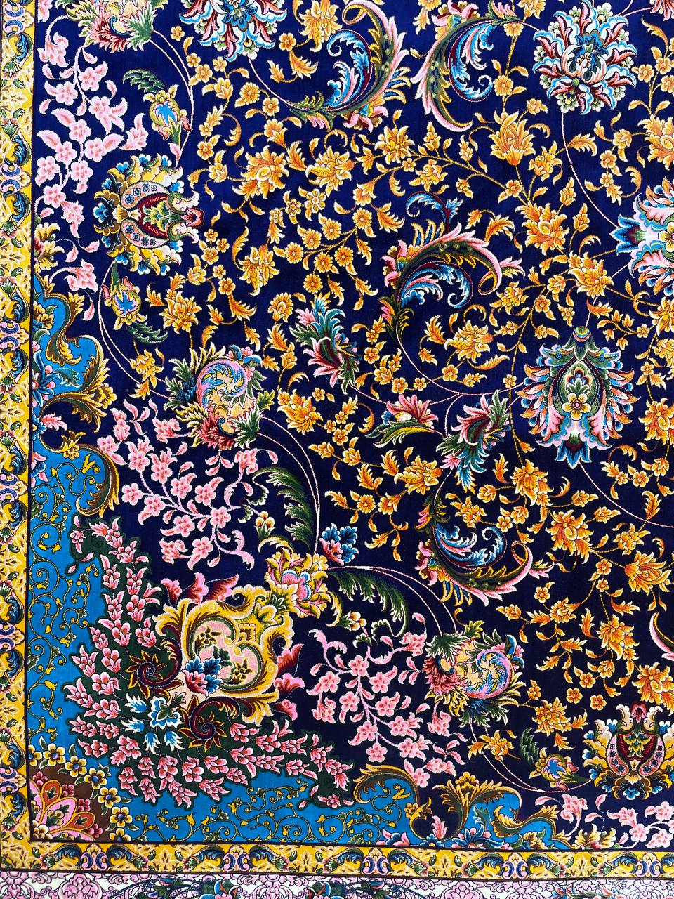 فرش ماشینی ابریشم 1500 شانه کاشان زمینه آبی کاربنی کد5570