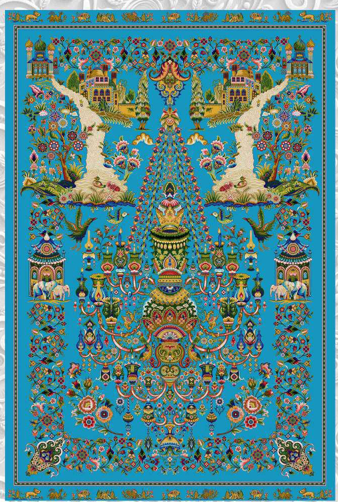 فرش ماشینی ابریشم 1500 شانه کاشان زمینه آبی کد5576
