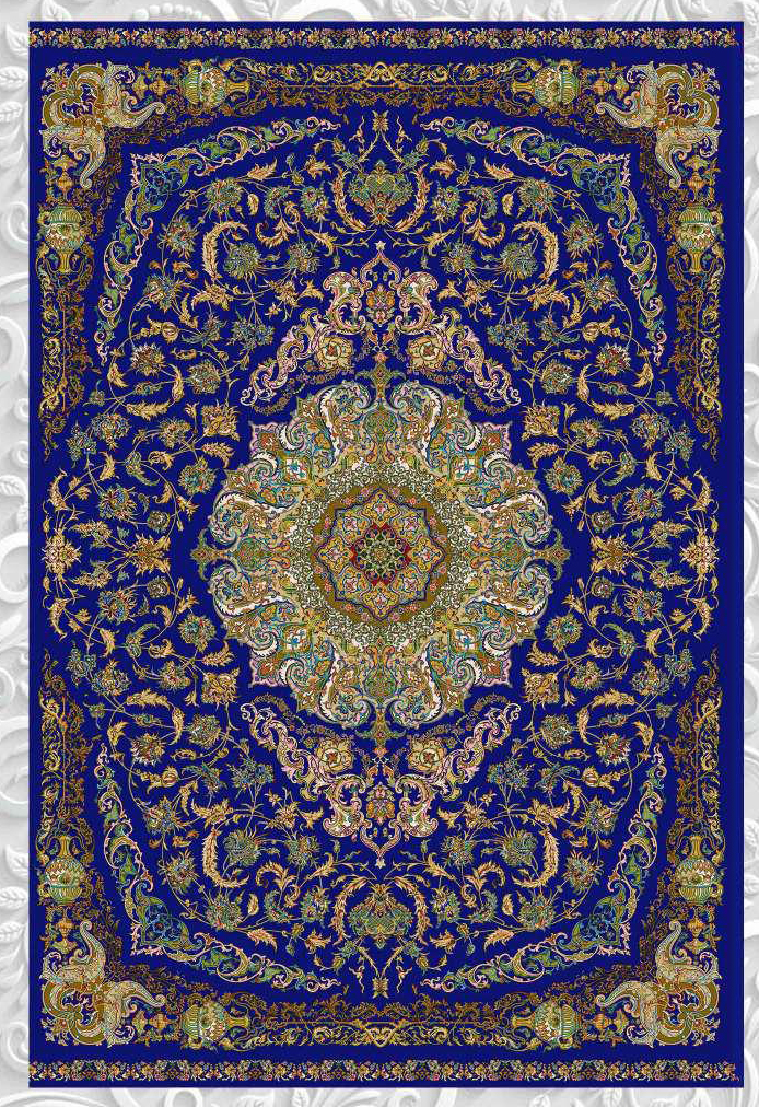 فرش ماشینی ابریشم 1500 شانه کاشان زمینه آبی کاربنی کد5577