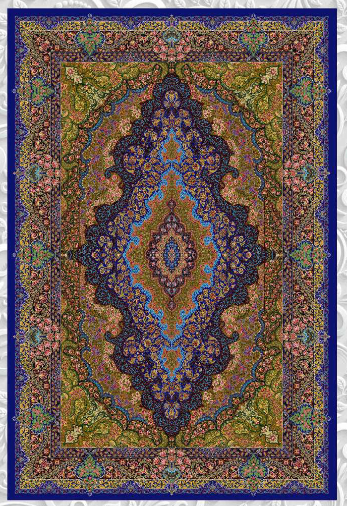 فرش ماشینی ابریشم 1500 شانه کاشان زمینه آبی کاربنی کد5522