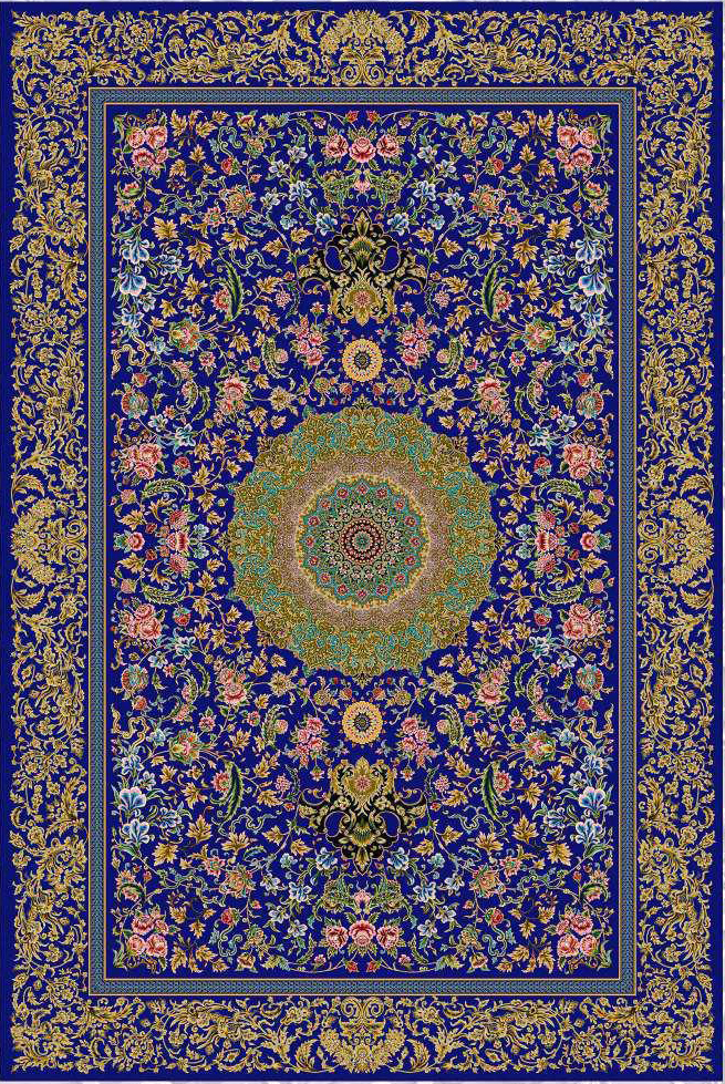 فرش ماشینی ابریشم 1500 شانه کاشان زمینه آبی کاربنی کد5525