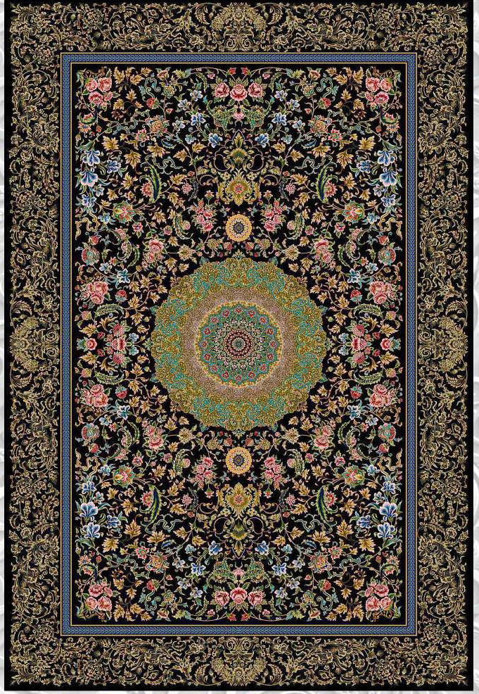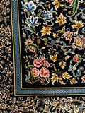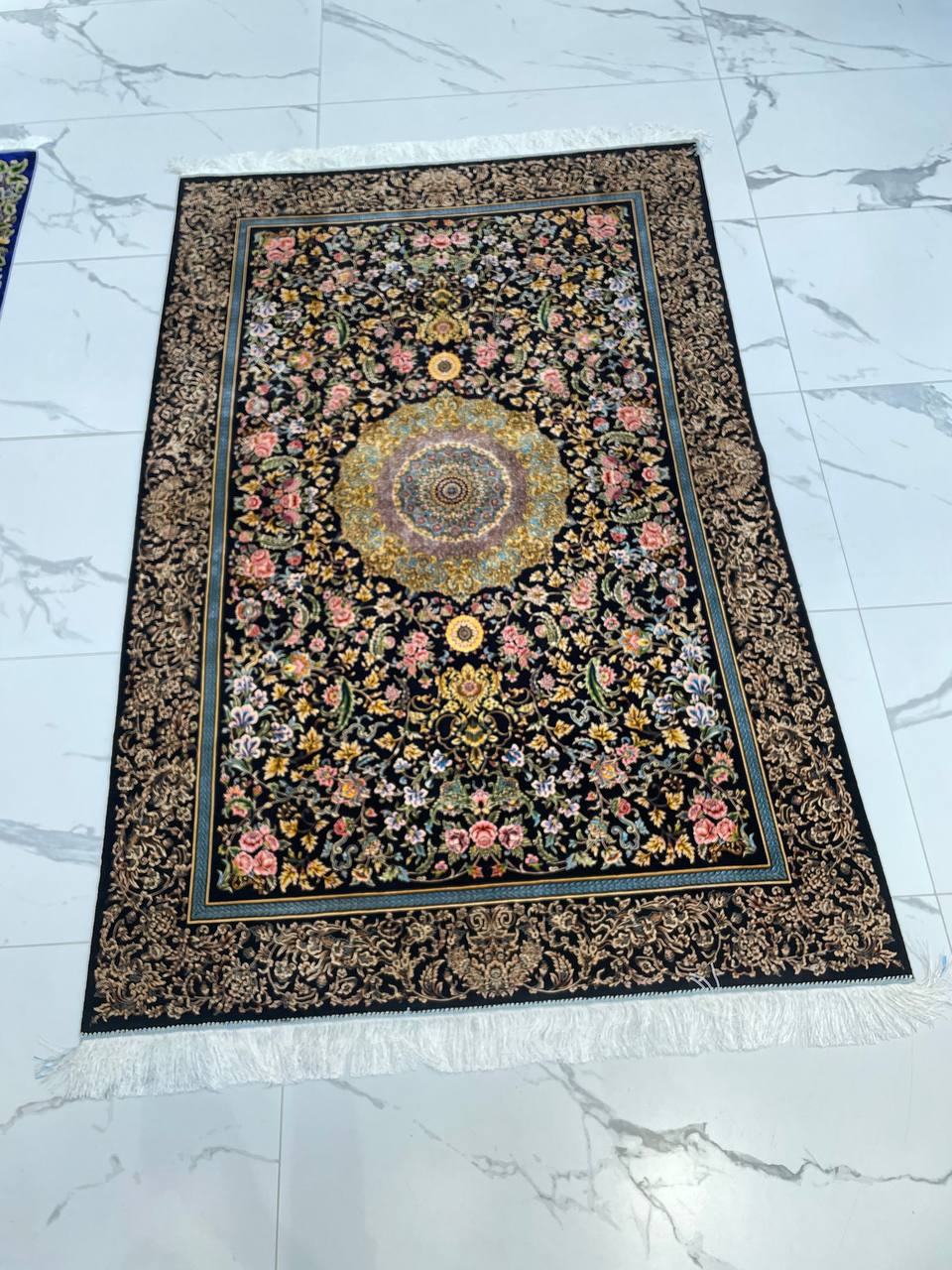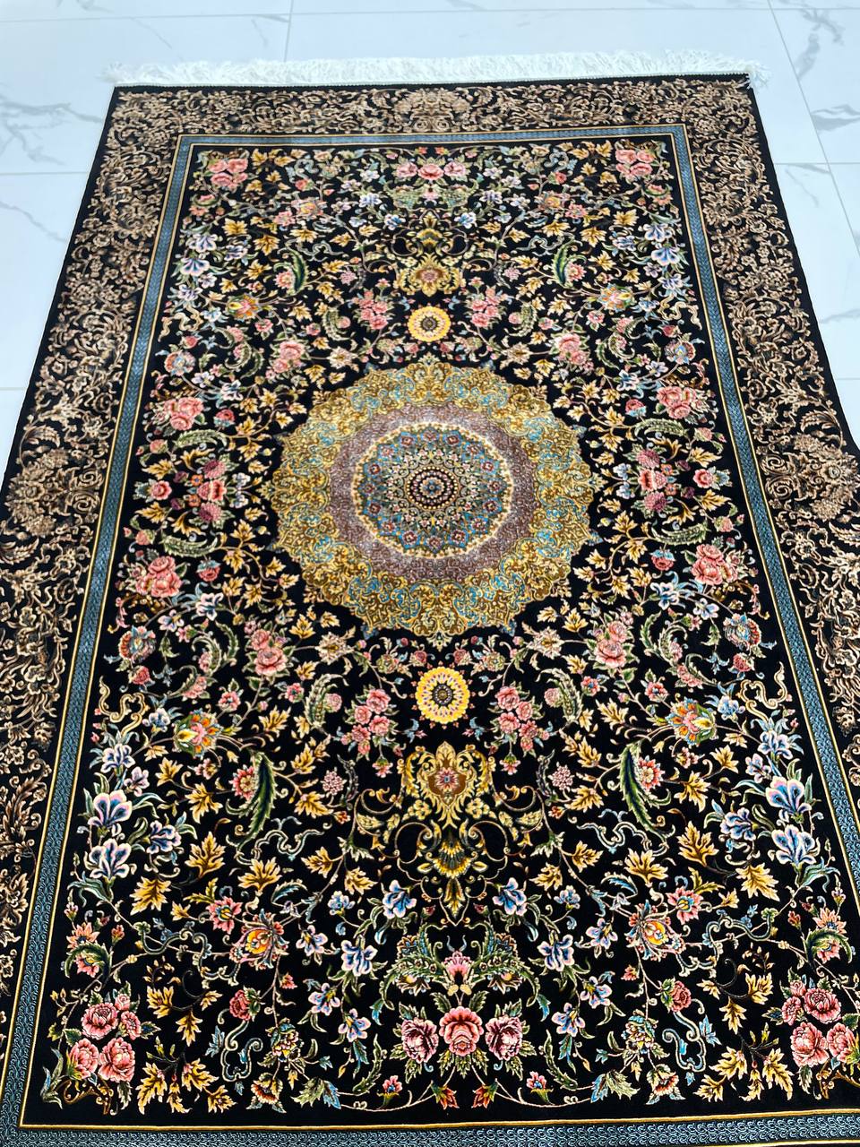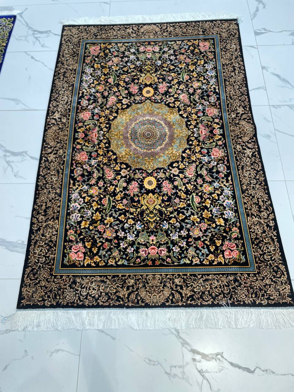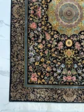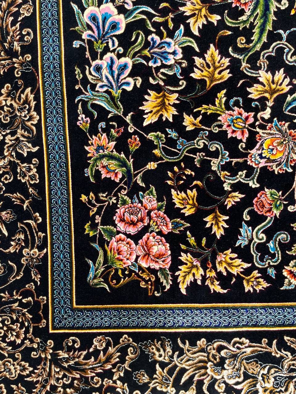 فرش ماشینی ابریشم 1500 شانه کاشان زمینه مشکی کد5525