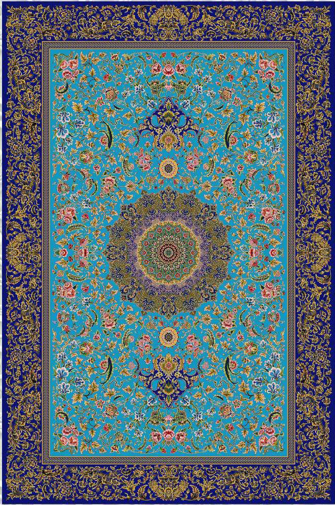 فرش ماشینی ابریشم 1500 شانه کاشان زمینه آبی کد5525