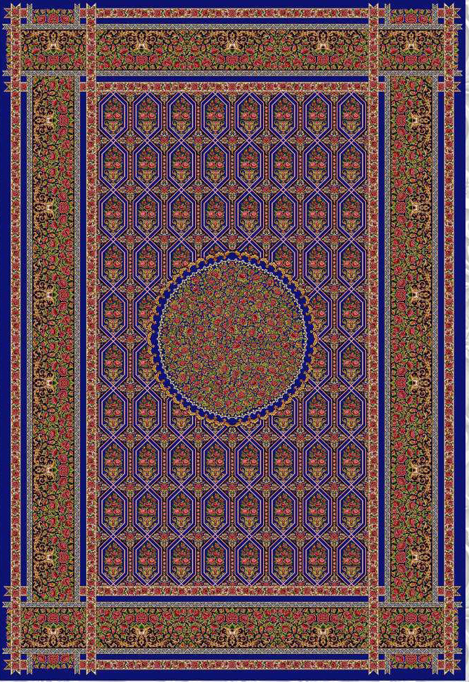 فرش ماشینی ابریشم 1500 شانه کاشان زمینه آبی کاربنی کد5528
