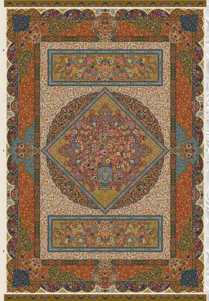 فرش ماشینی ابریشم 1500 شانه کاشان زمینه کرم کد5531