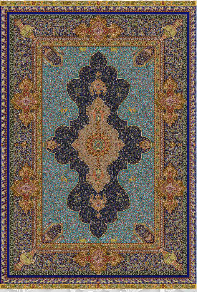 فرش ماشینی ابریشم 1500 شانه کاشان زمینه آبی کاربنی کد5533