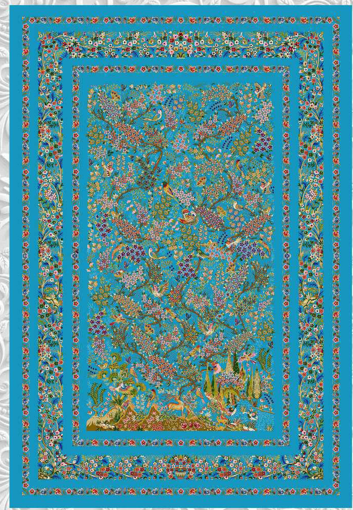 فرش ماشینی ابریشم 1500 شانه کاشان زمینه آبی کد5538