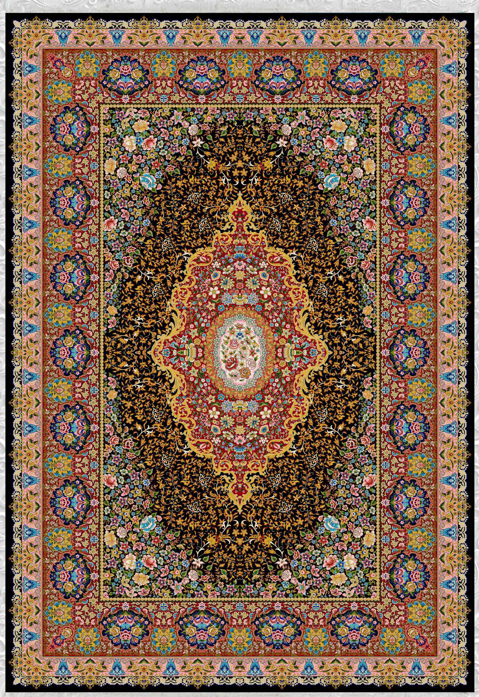 فرش ماشینی ابریشم 1500 شانه کاشان زمینه مشکی کد5539