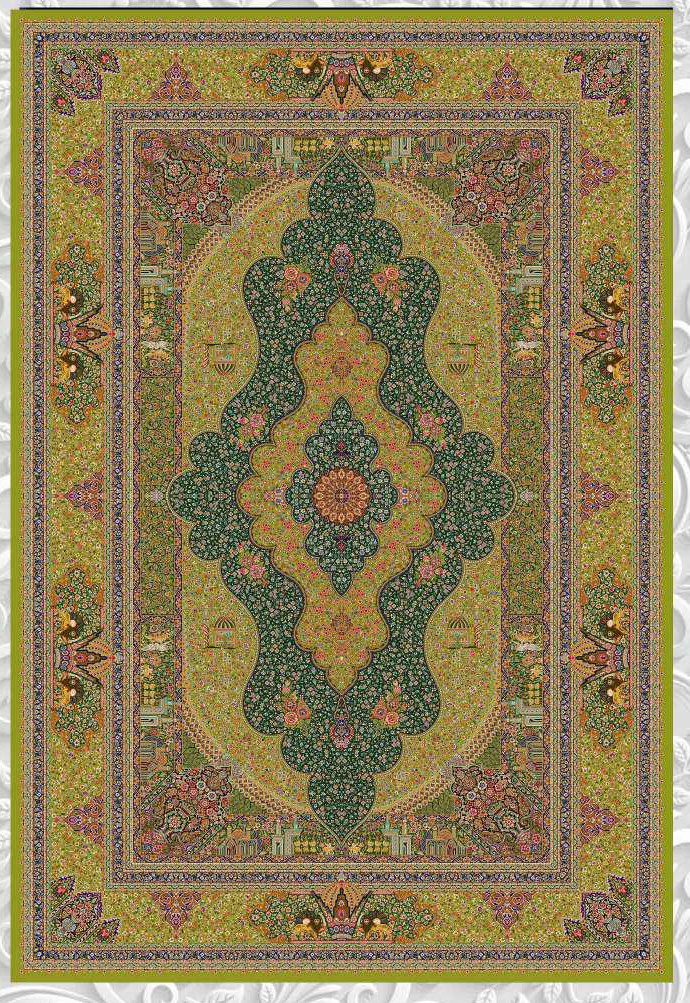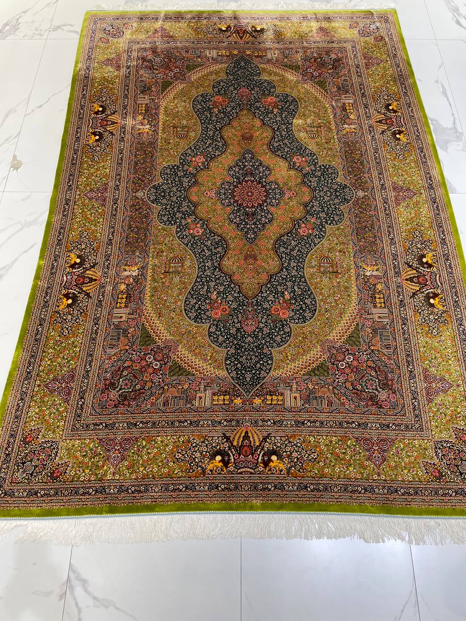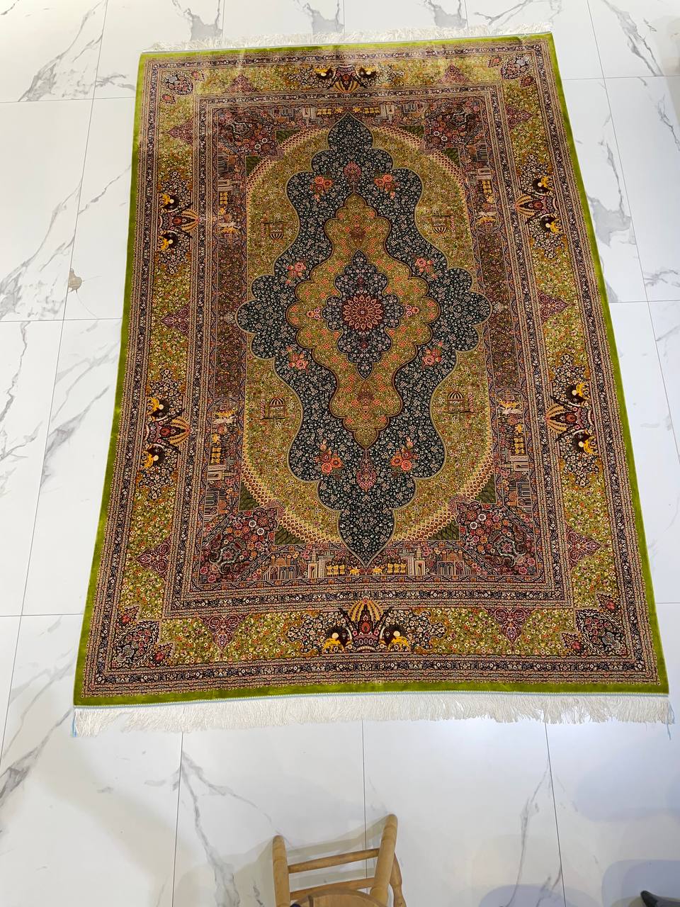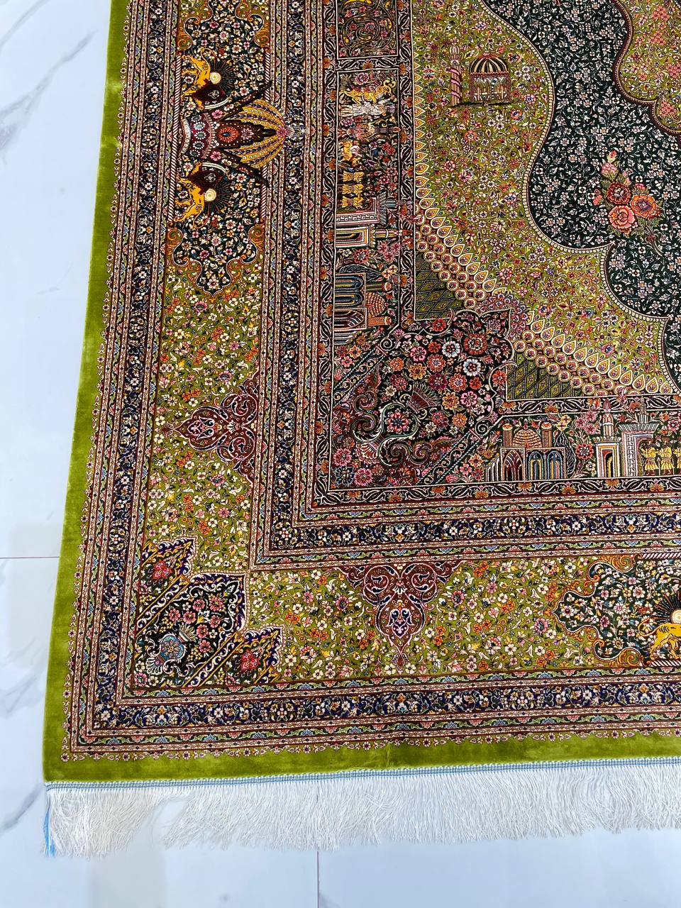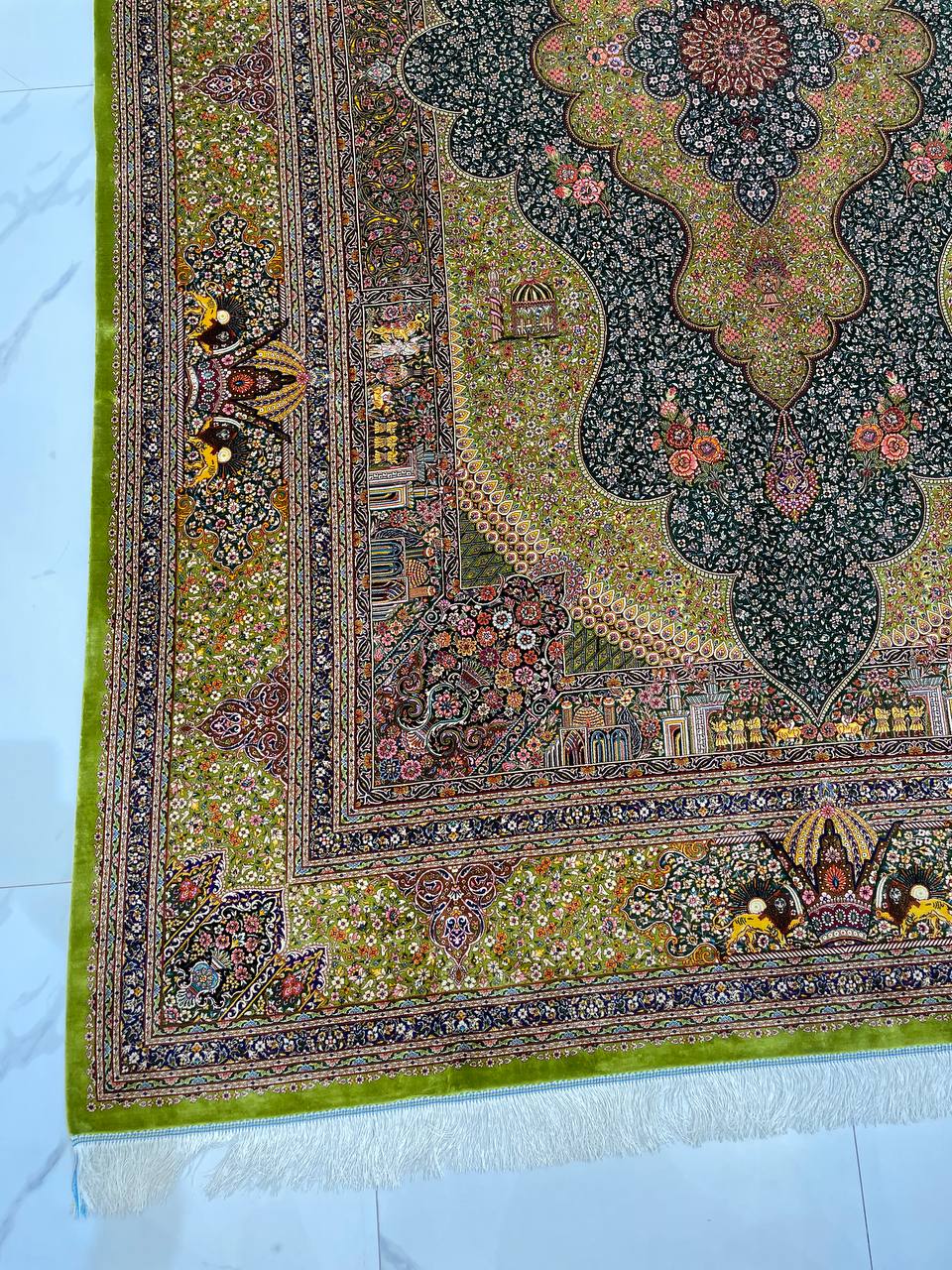 فرش ماشینی ابریشم 1500 شانه کاشان زمینه سبز کد5542