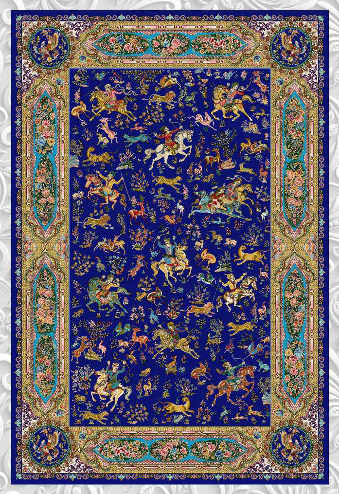فرش ماشینی ابریشم 1500 شانه کاشان زمینه آبی کاربنی کد5544