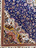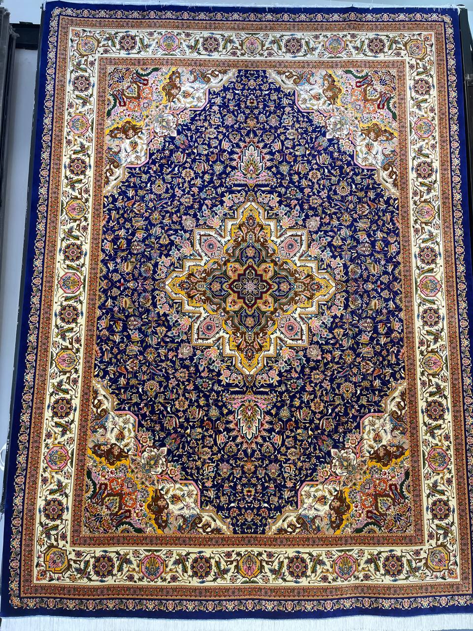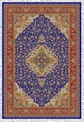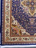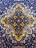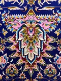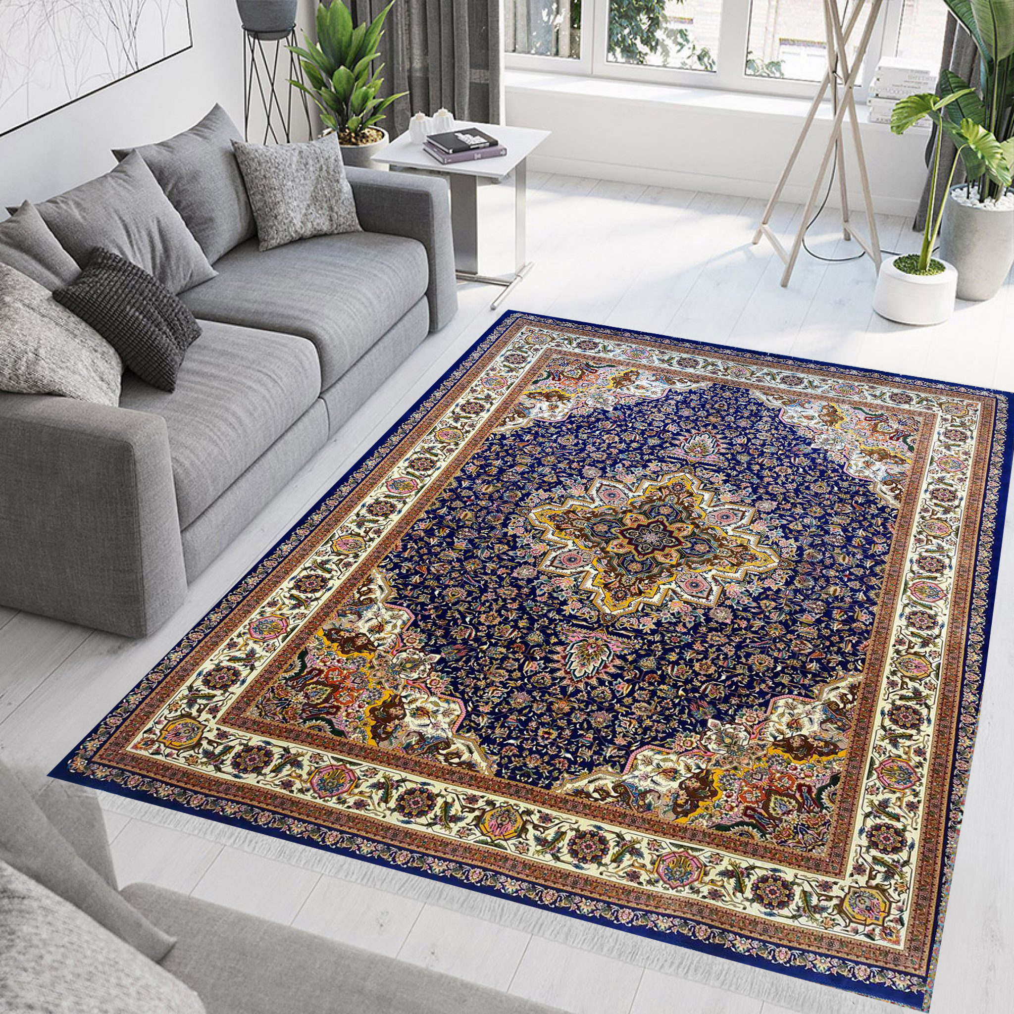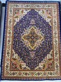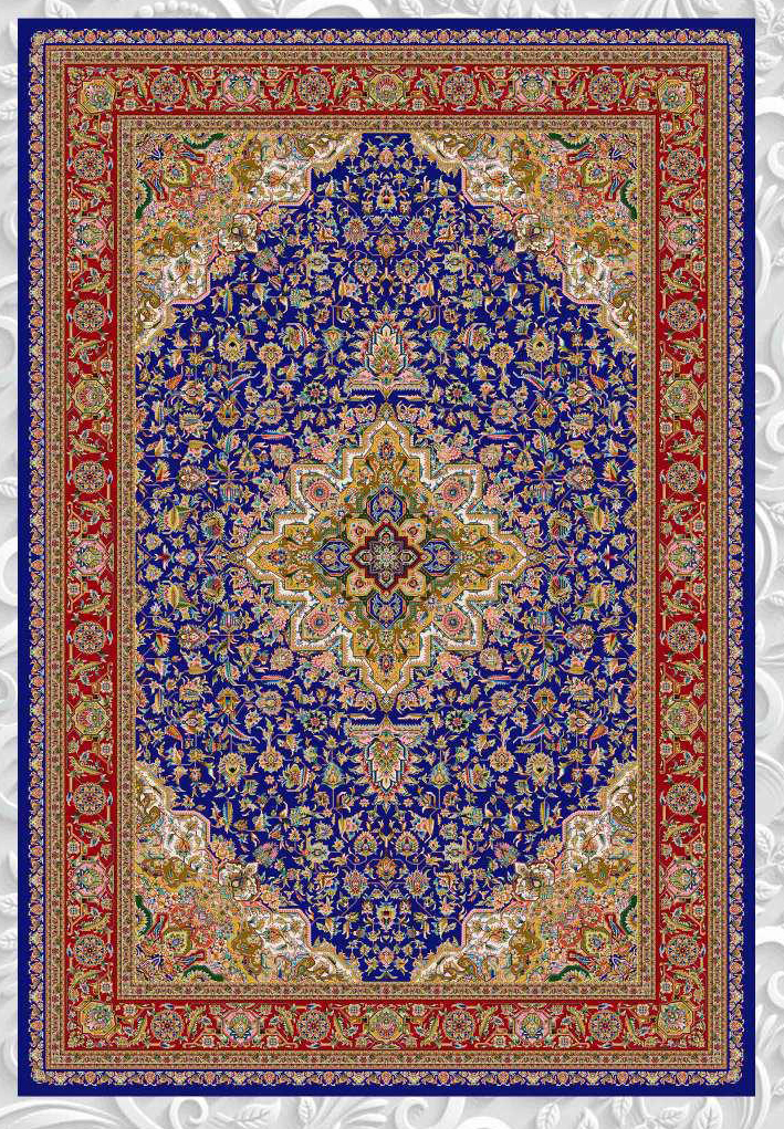 فرش ماشینی ابریشم 1500 شانه کاشان زمینه آبی کاربنی کد5545