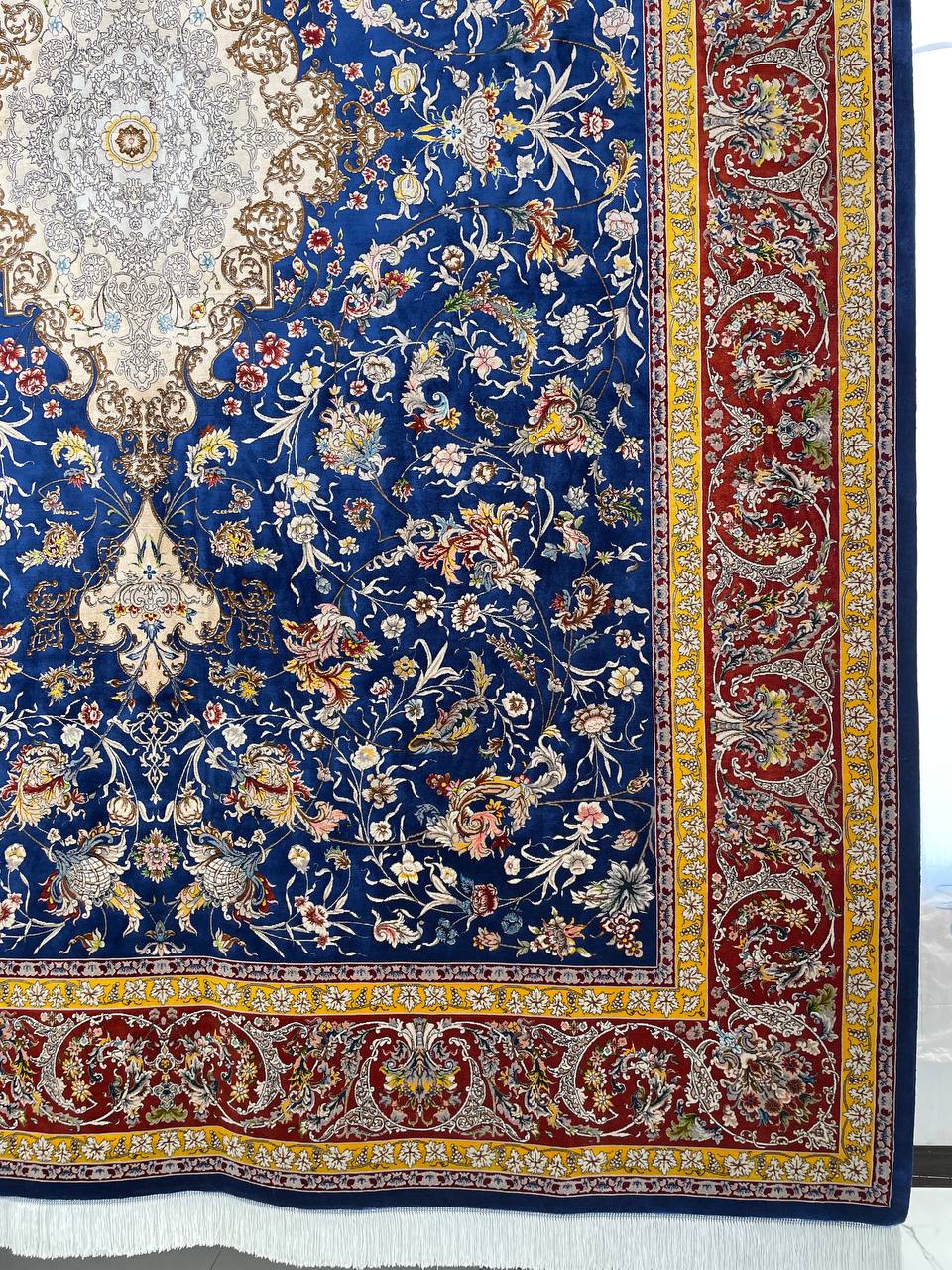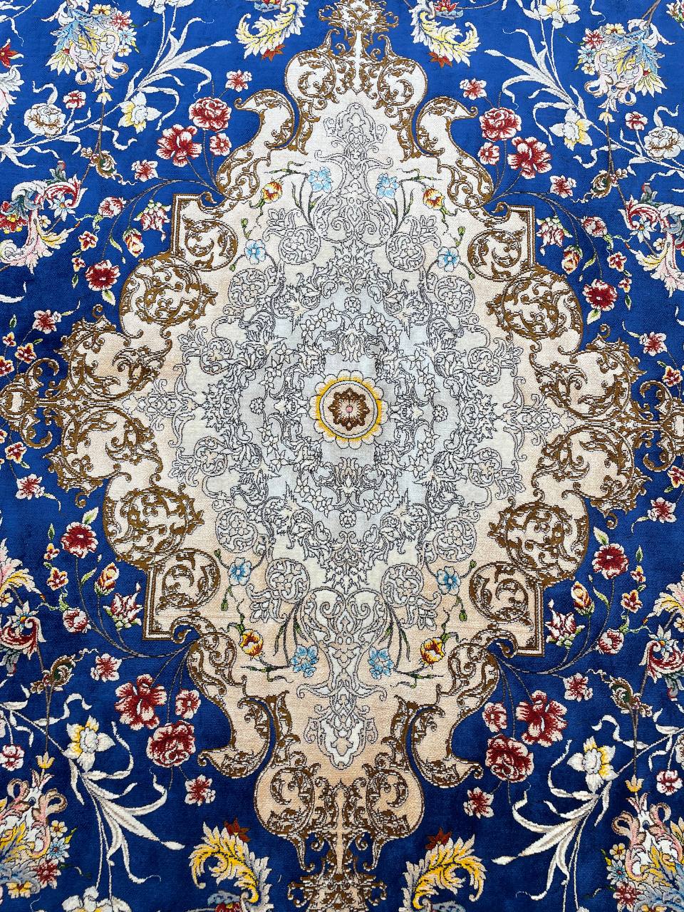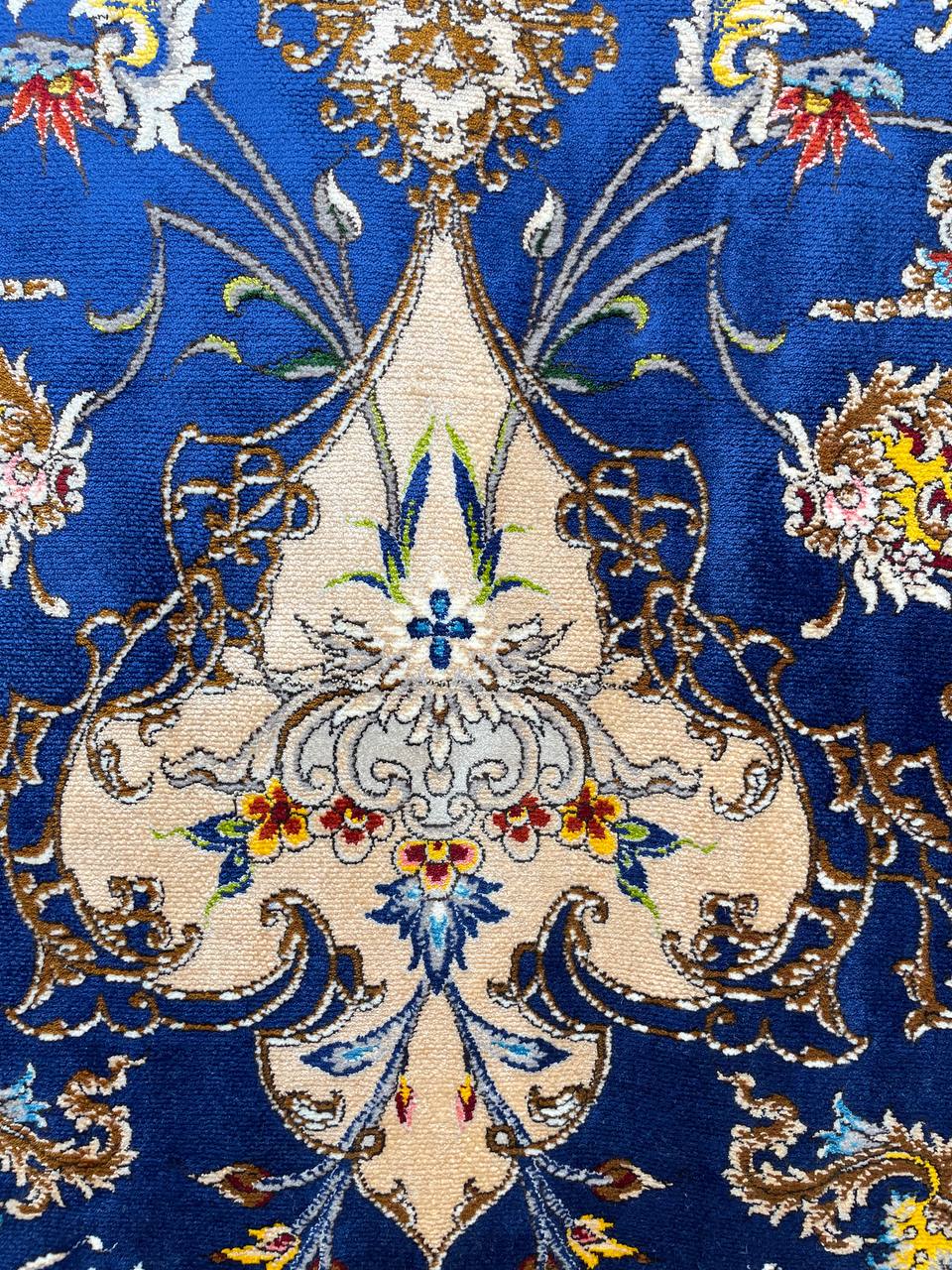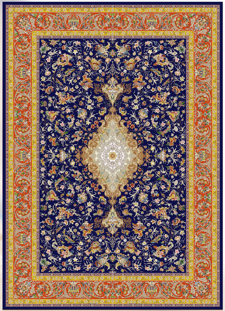 فرش ماشینی پشم ابریشم 1200 شانه زمینه آبی کاربنی کد3252