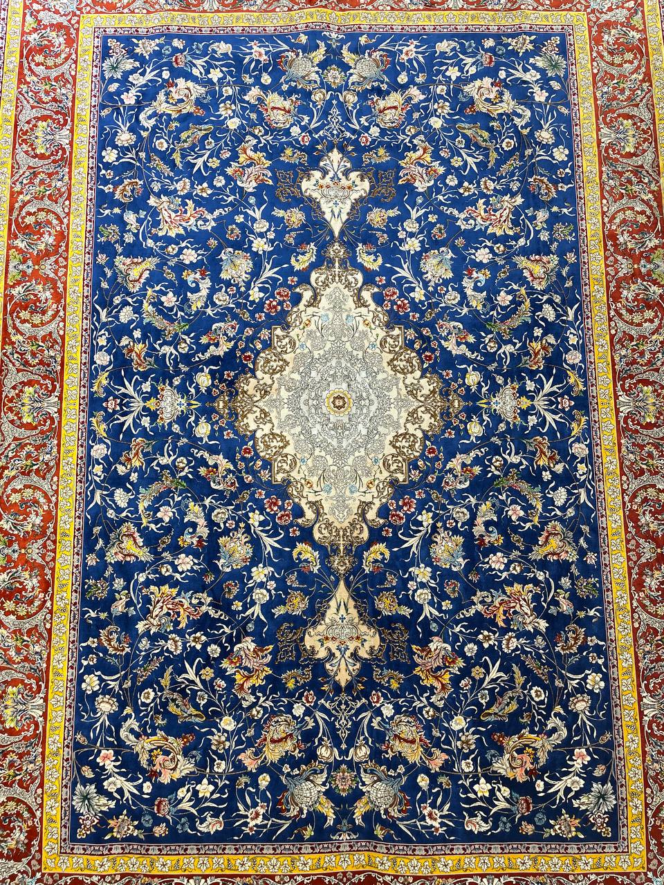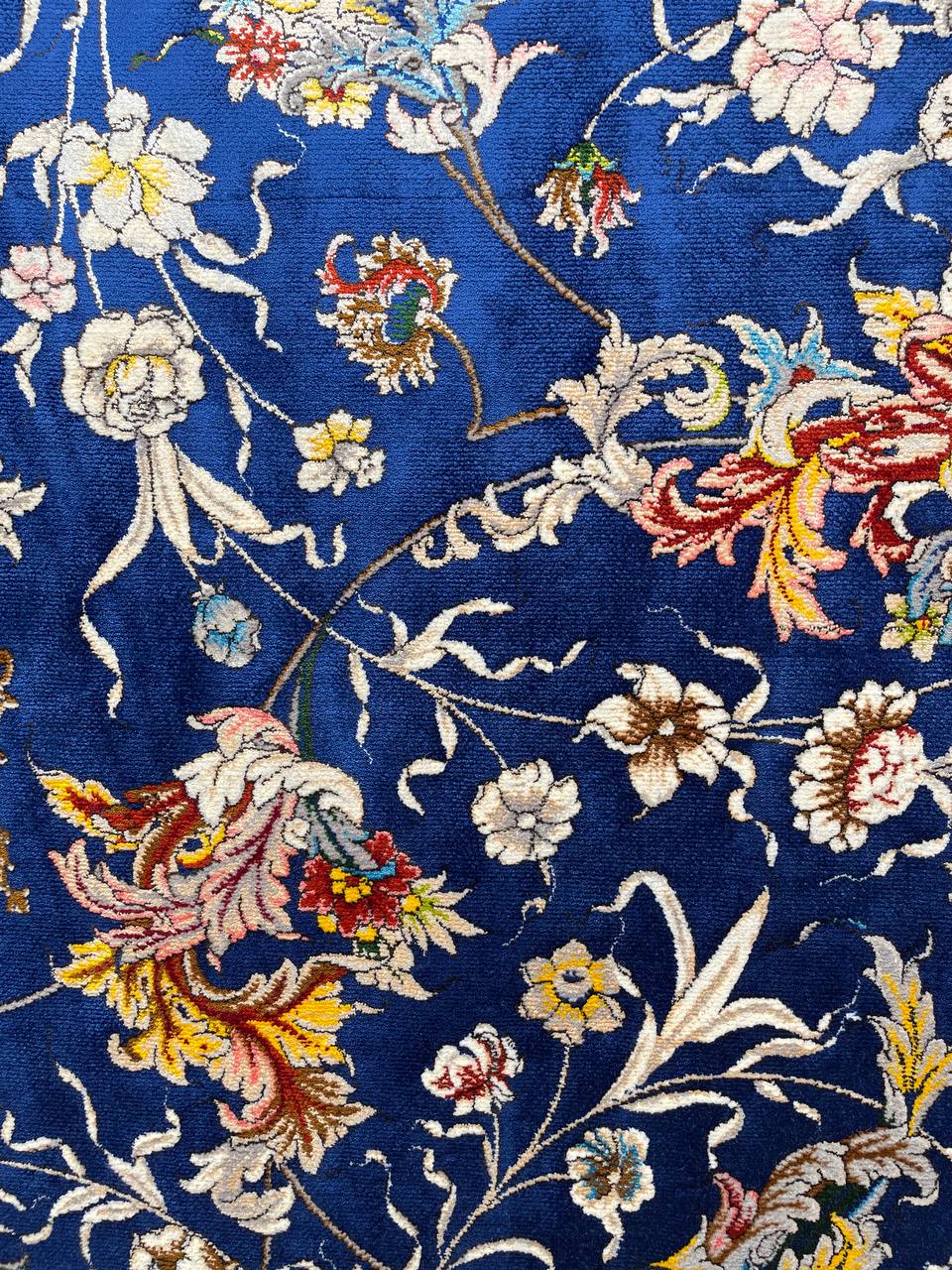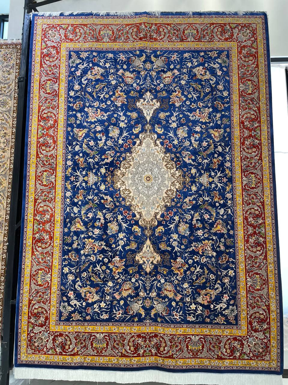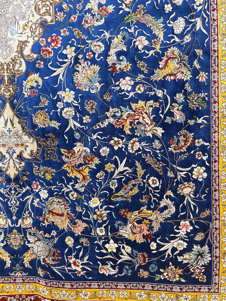 فرش ماشینی پشم ابریشم 1200 شانه زمینه آبی کاربنی کد3252