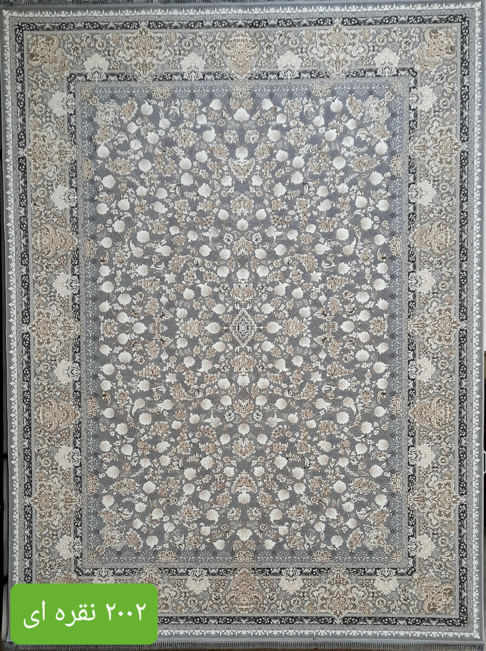 فرش ماشینی کاشان 1200شانه درجه یک زمینه نقره ای کد2002طلاکوب