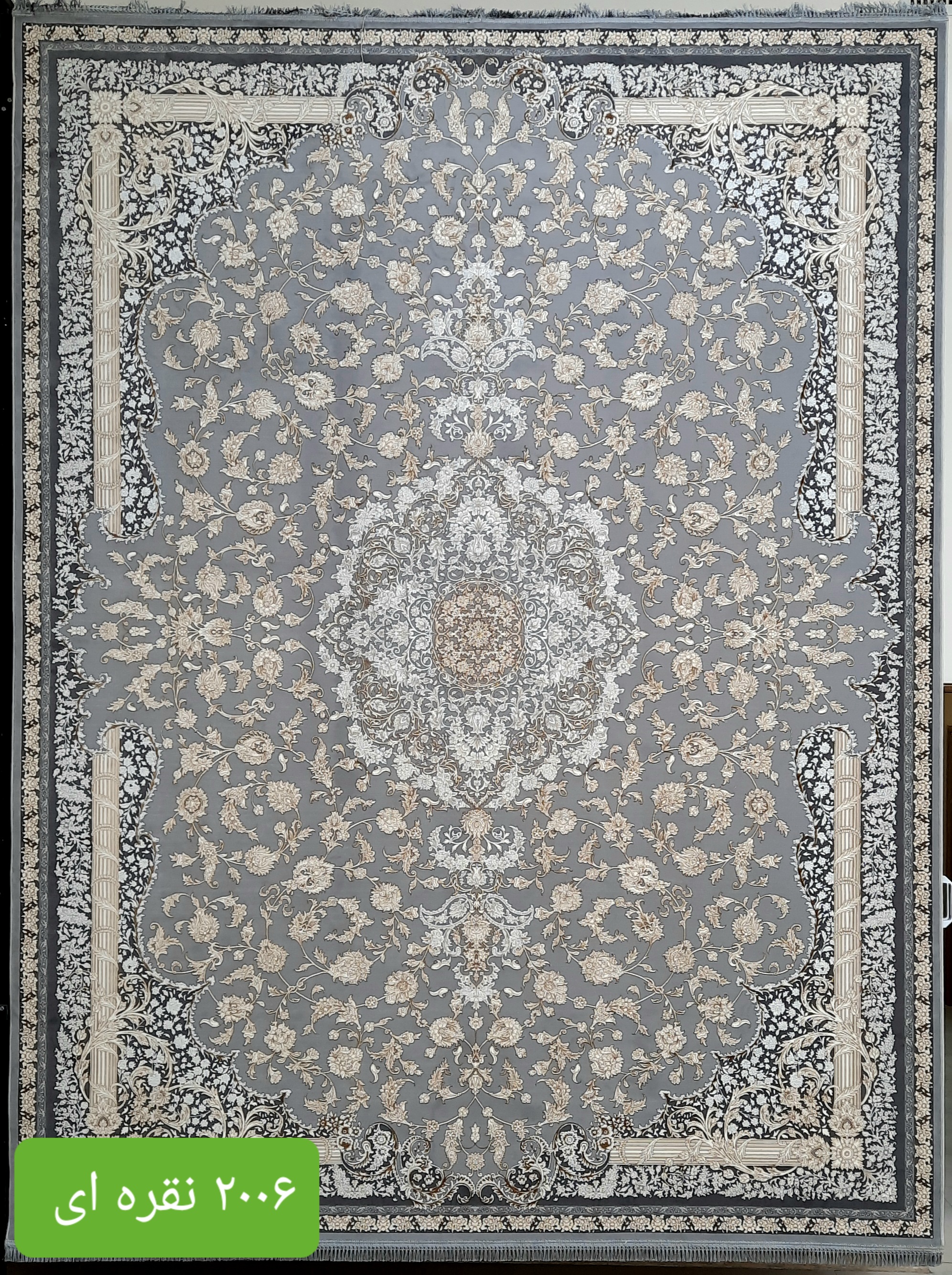 فرش ماشینی کاشان 1200شانه درجه یک زمینه نقره ای کد 2006 طلاکوب