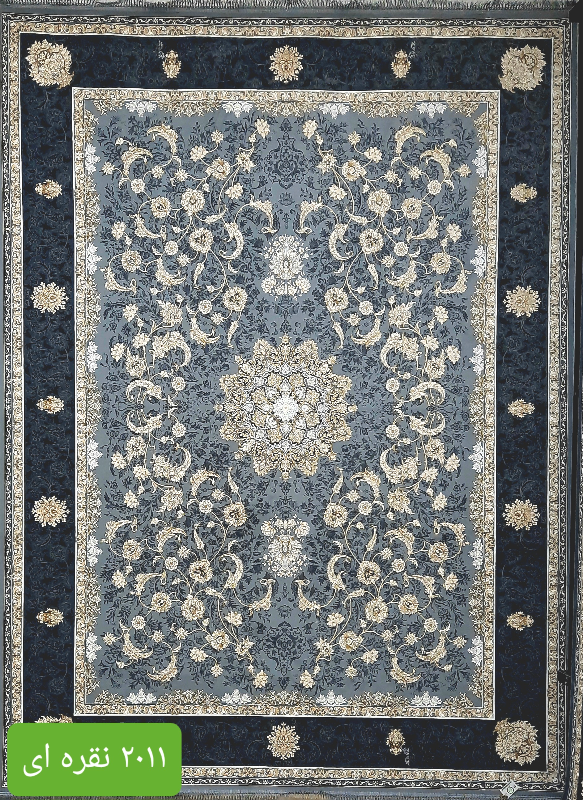 فرش ماشینی کاشان 1200شانه درجه یک زمینه نقره ای کد 2011 طلاکوب