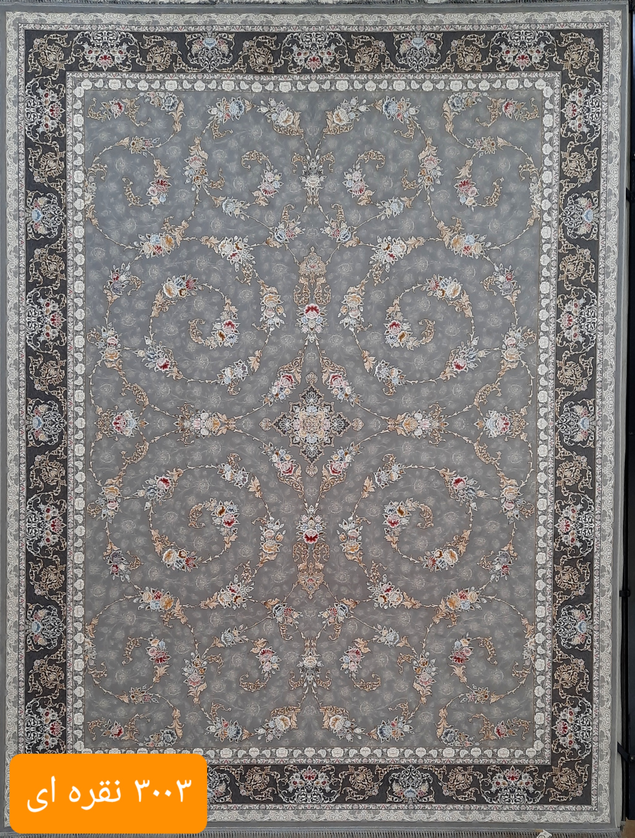فرش ماشینی کاشان 1200شانه درجه یک زمینه نقره ای کد3003