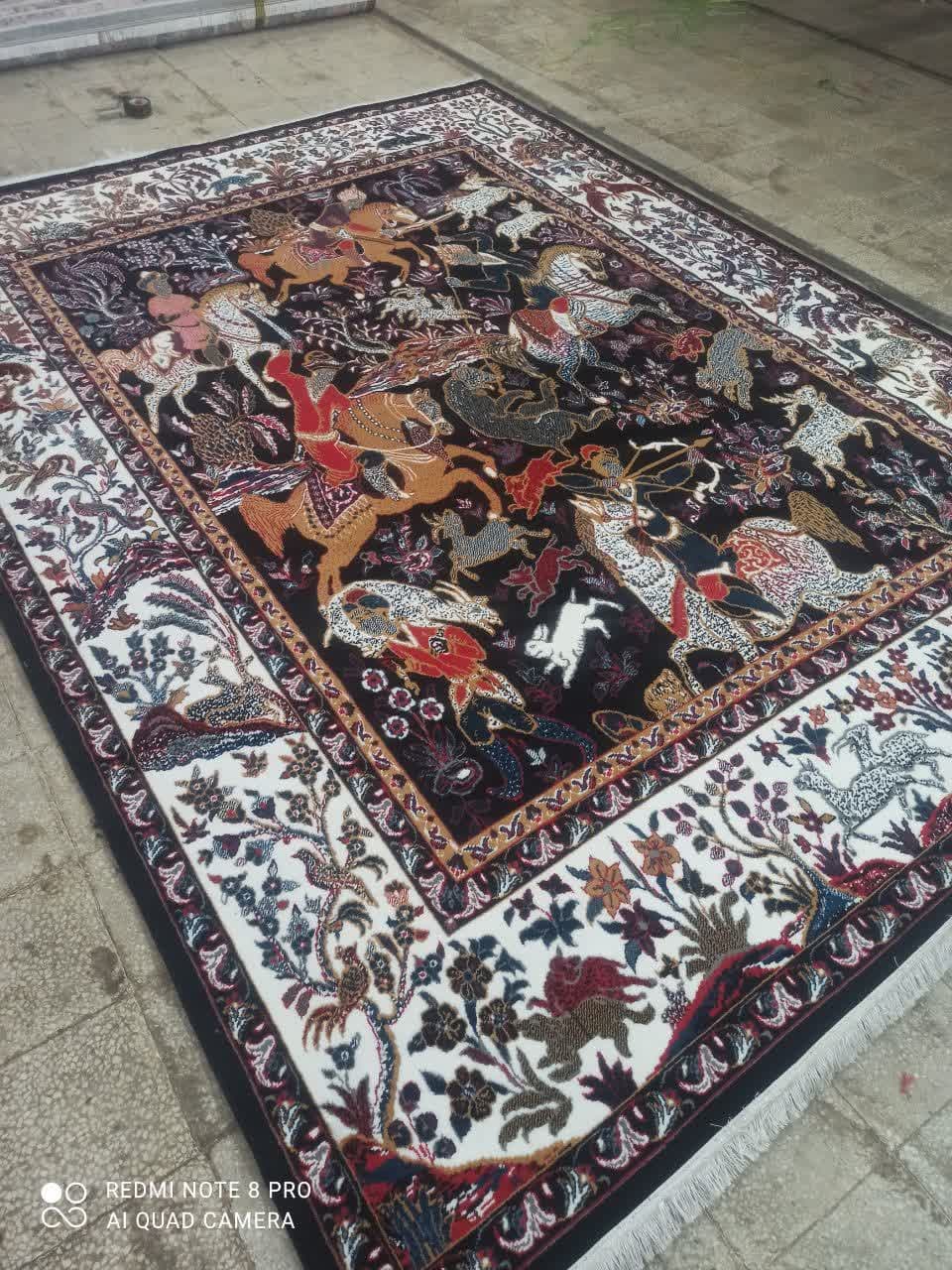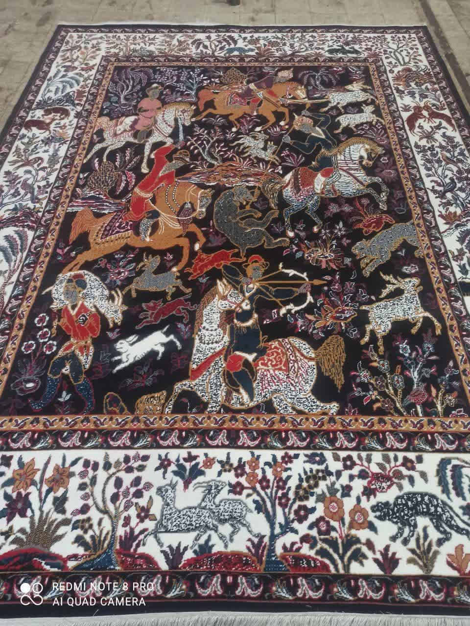 فرش ماشینی ارزان قیمت نقشه شکارگاه زمینه سرمه ای
