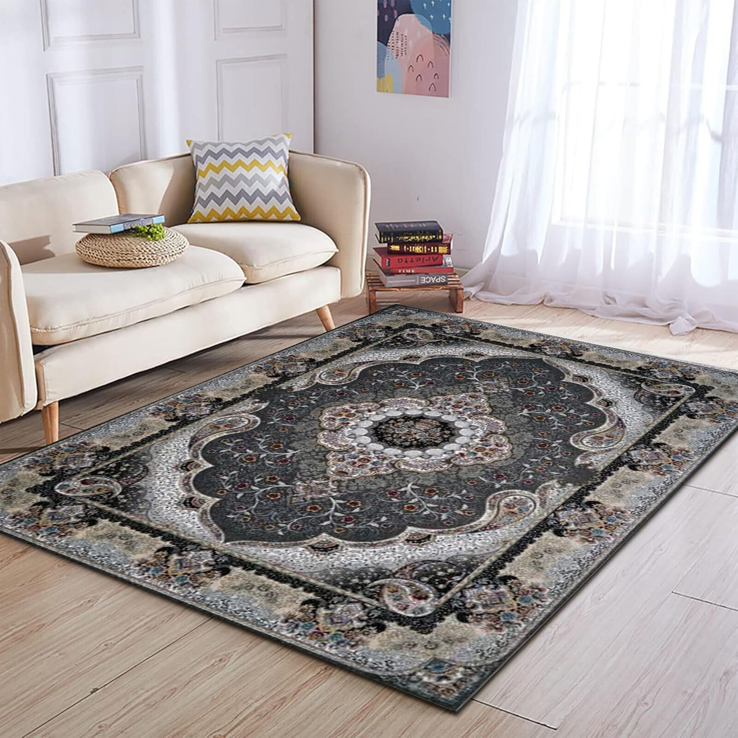 فرش ماشینی کاشان 700 شانه کد 7018 زمینه دودی
