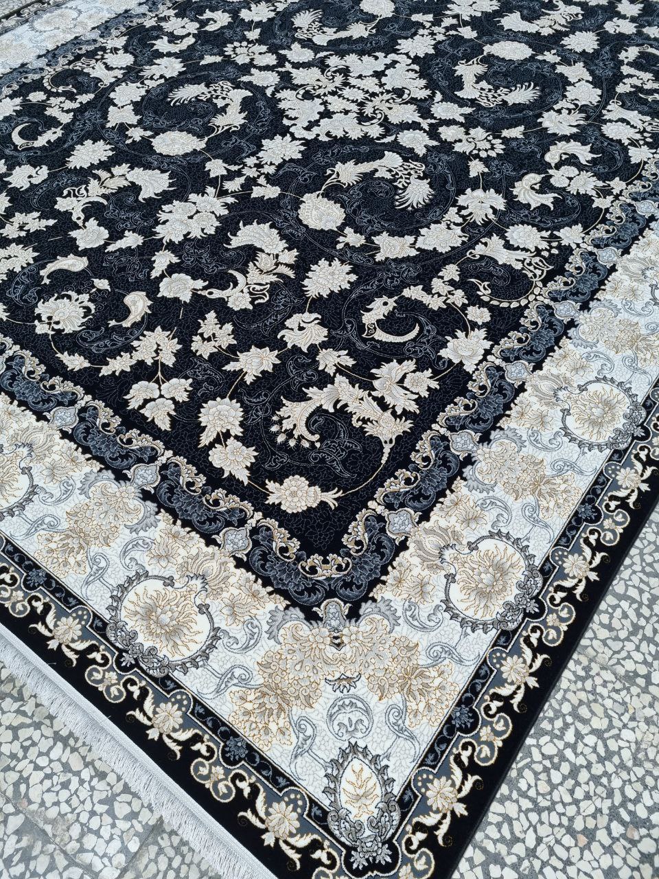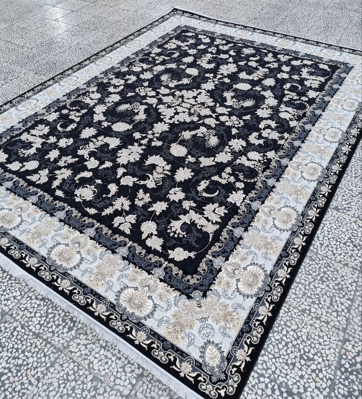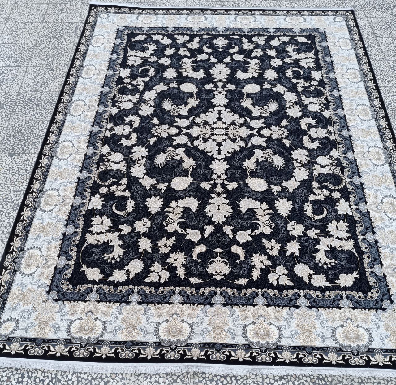 فرش ماشینی کاشان 700 شانه نقشه طاووس زمینه سرمه ای