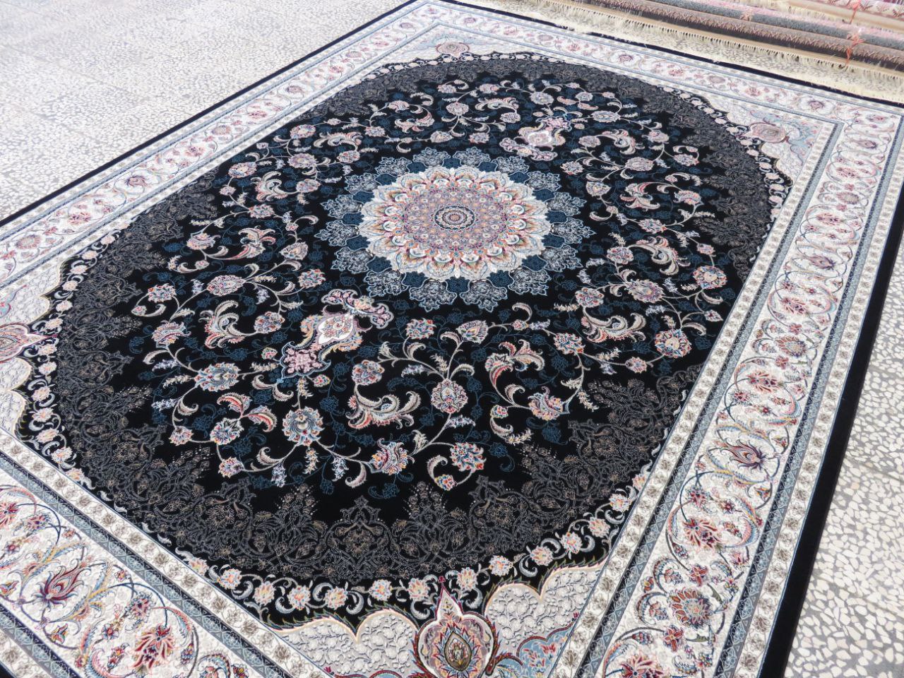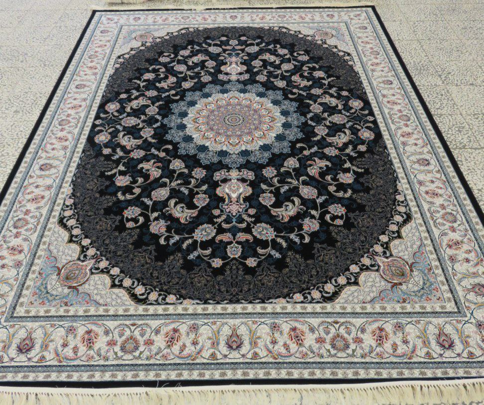فرش ماشینی کاشان 700 شانه نقشه گلاریس زمینه سرمه ای