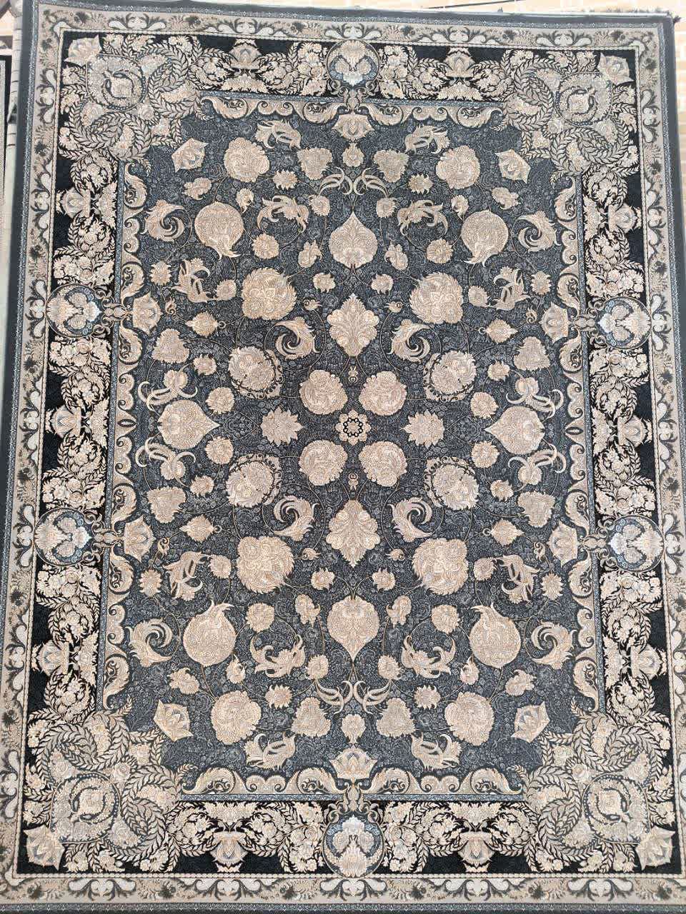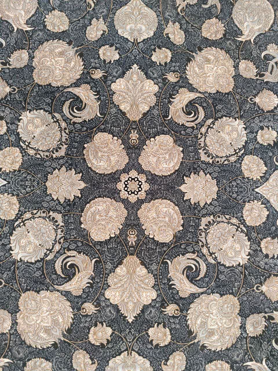 فرش ماشینی کاشان 700 شانه نقشه تاج زمینه دودی طلاکوب